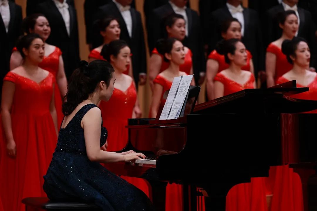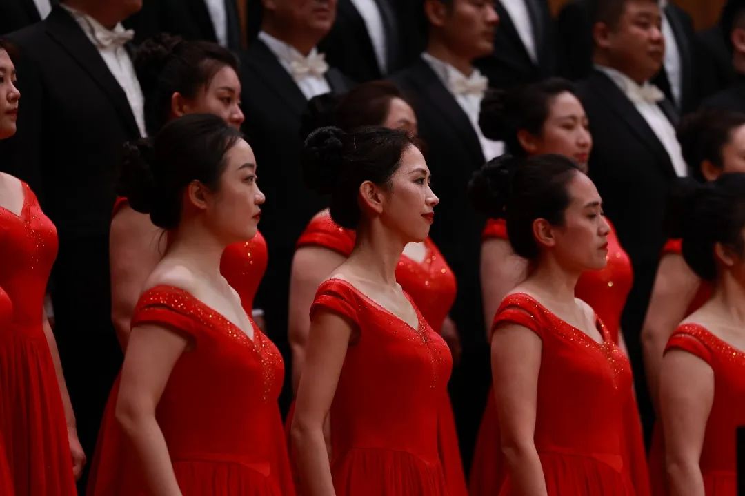 整场演出大气磅礴、气势恢宏、激昂奋进。激昂旋律涌动蓬勃气势,悠扬歌声唱响壮阔征途,观众们在音乐里重温荣光梦想,在歌声中坚定理想信念。国家大剧院合唱团和北邮爱乐合唱团合唱返场曲目《我和我的祖国》,在热情歌颂中共诉初心情怀,将现场气氛推向高潮。全场深情合唱《歌唱祖国》,掌声雷动,红旗飘扬。