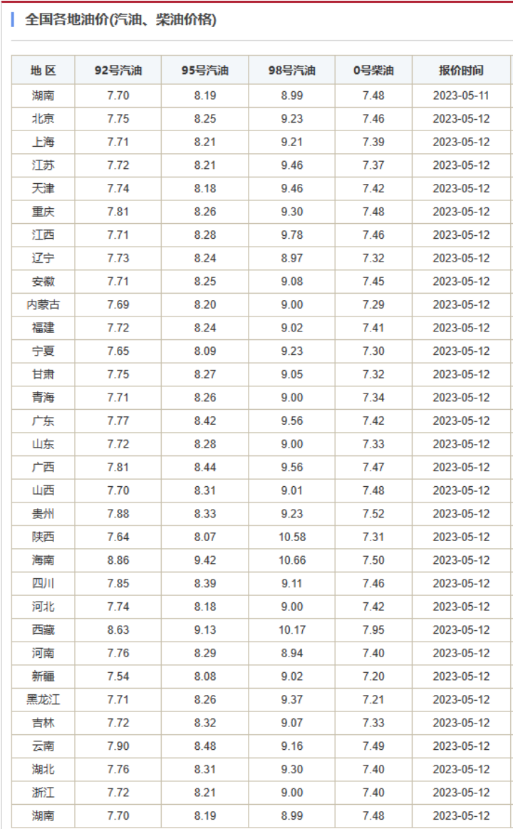 来源:今日油价查询