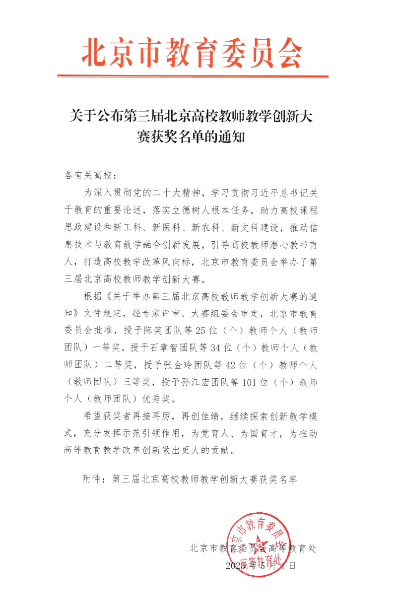 日前,北京市教育委员会高等教育处公布了第三届北京高校教师教学创新大赛获奖名单,首都师范大学在大赛中获得一等奖、二等奖、三等奖各一项,优秀奖三项。