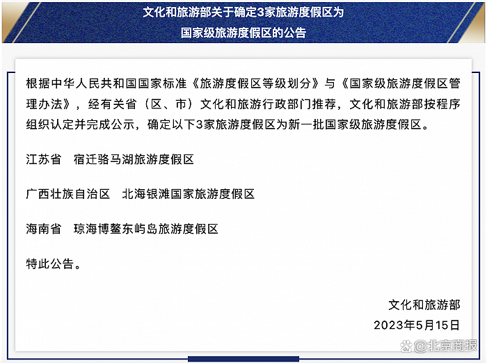 据“文旅之声”微信公众号,近日,文化和旅游部按程序组织认定并完成公示,确定江苏省宿迁骆马湖旅游度假区、广西壮族自治区北海银滩国家旅游度假区、海南省琼海博鳌东屿岛旅游度假区为新一批国家级旅游度假区。