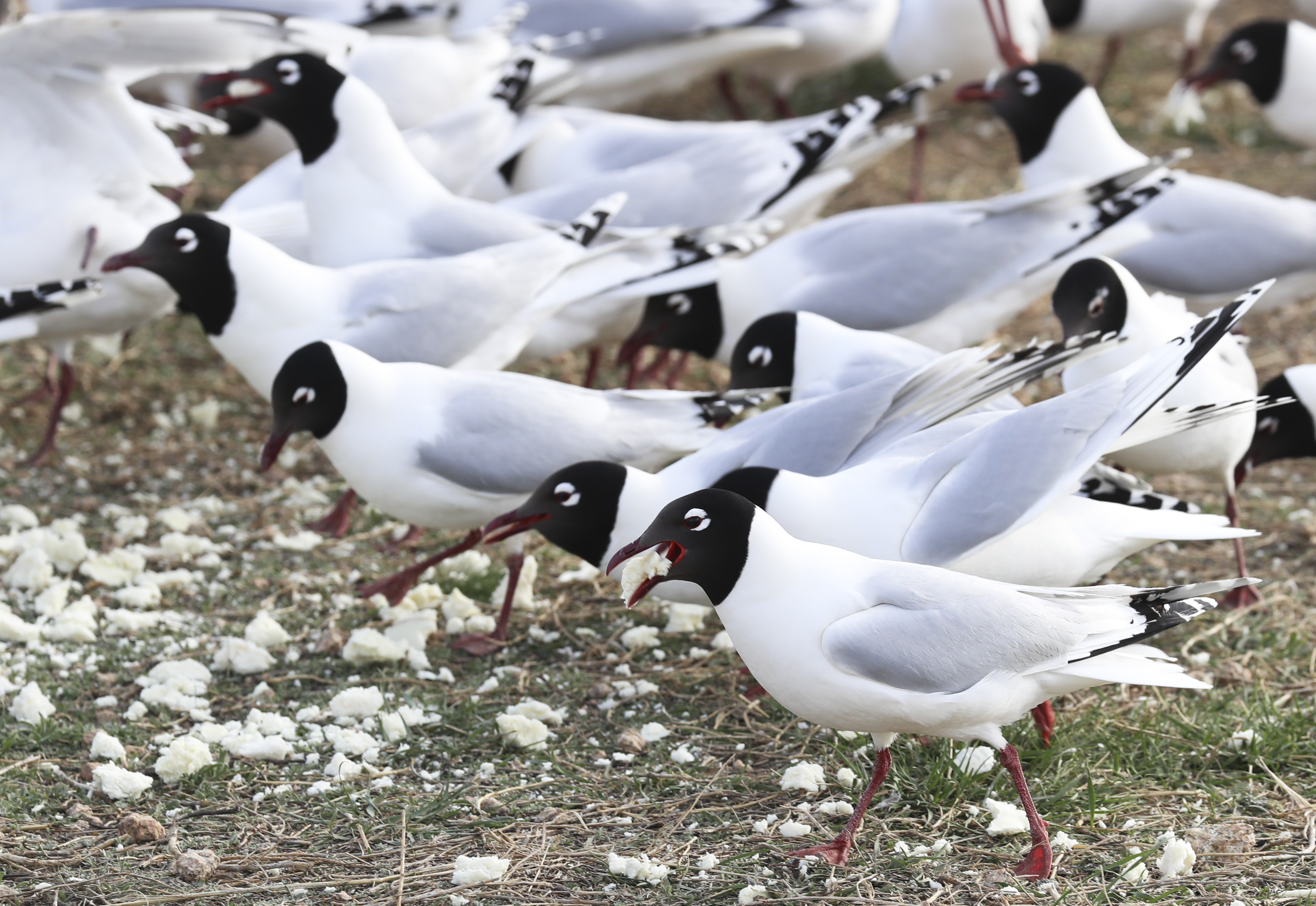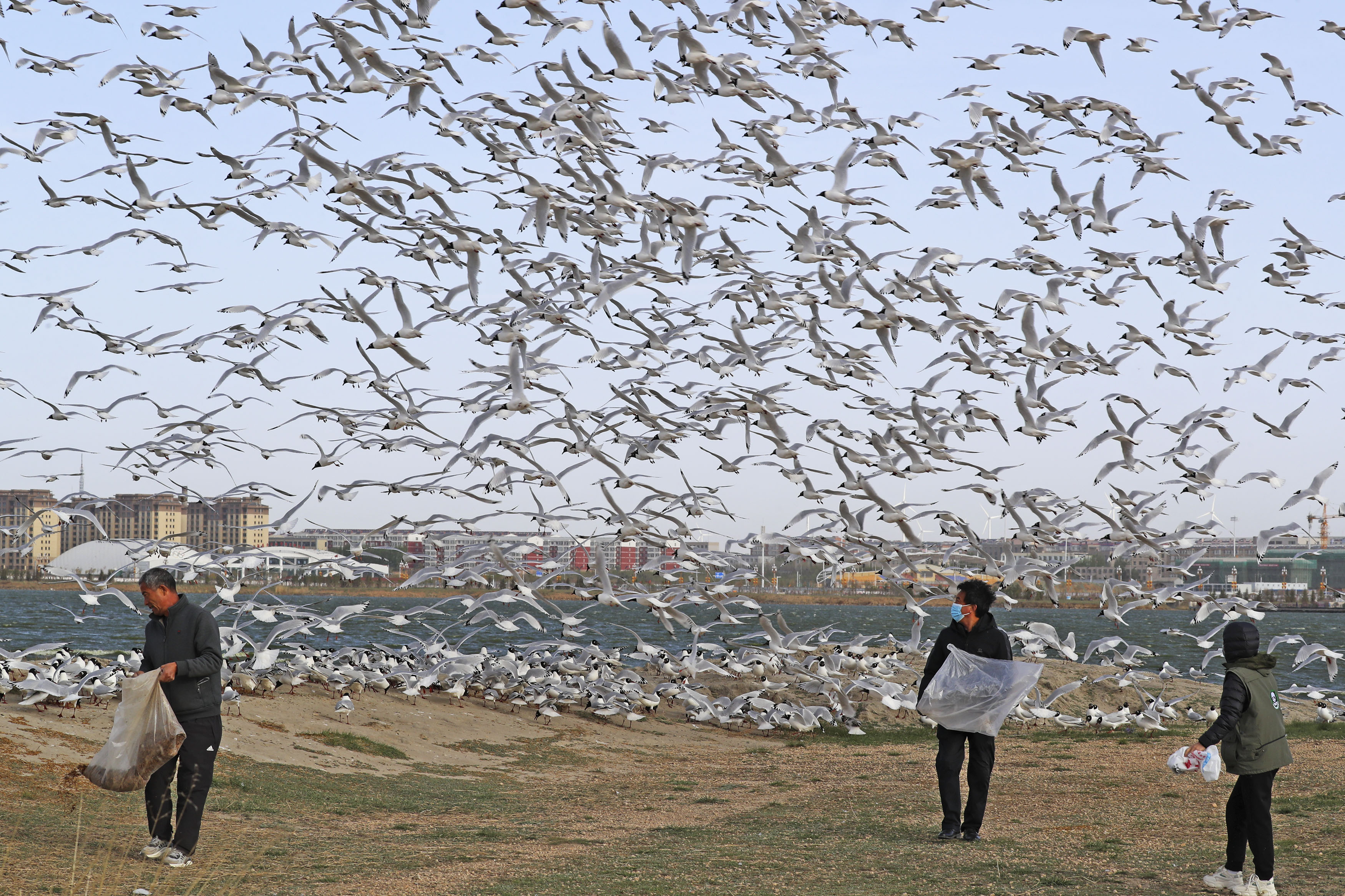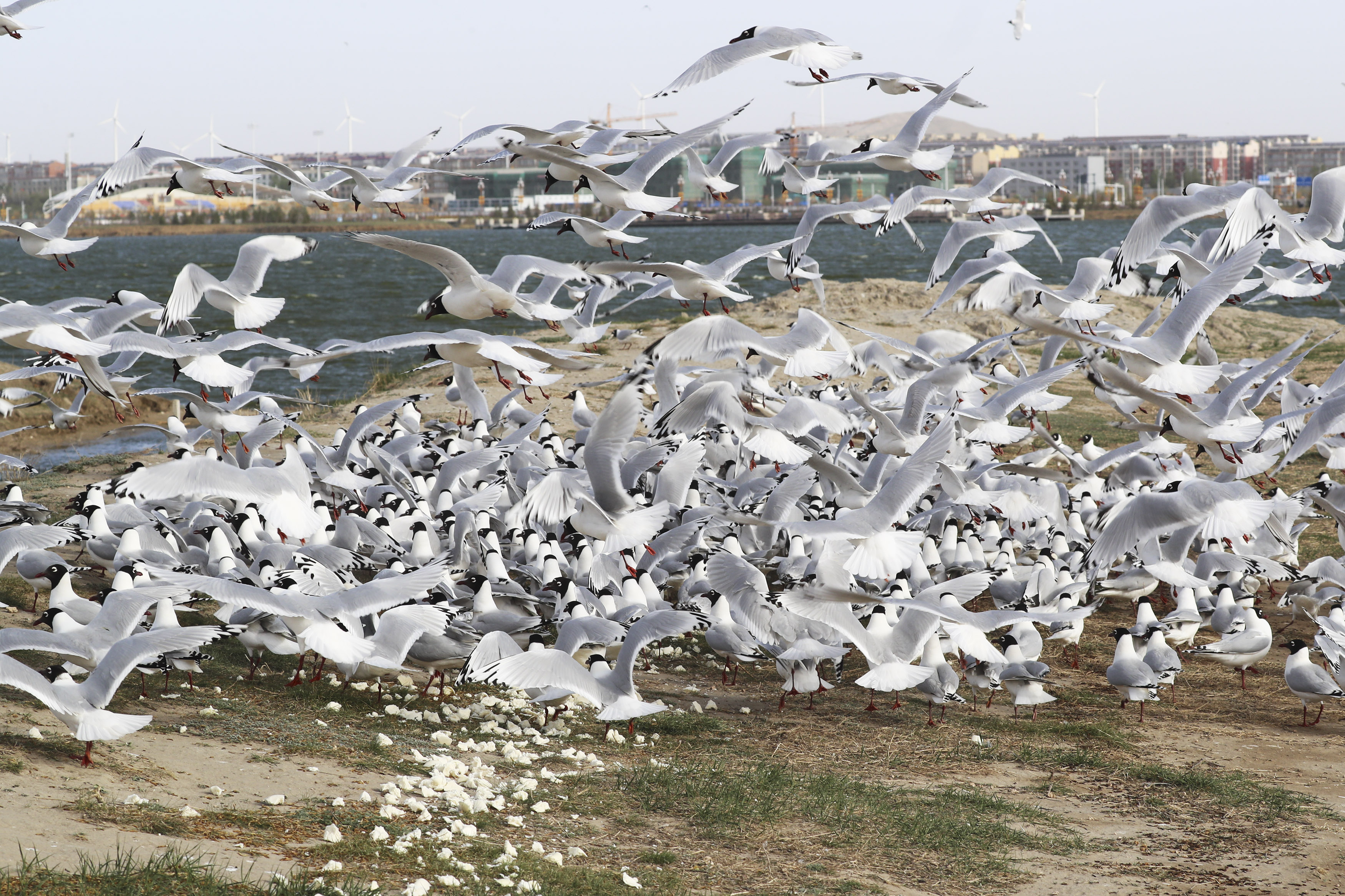 5月21日清晨,针对近几日的大风降温天气,康保县遗鸥保护协会志愿服务队在康巴诺尔湿地公园给遗鸥投喂食物。