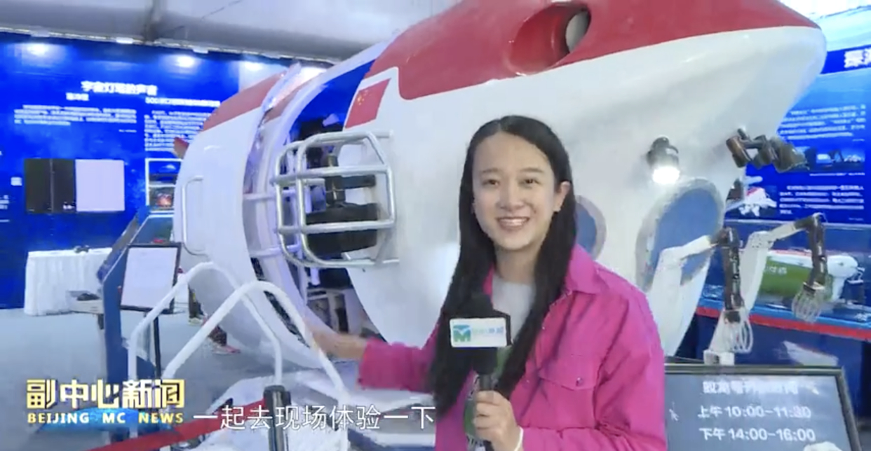 记者孙颖:“在我身后有一台蛟龙号(模拟)体验机 那里面到底能够看到 什么样的场景呢 接下来请跟随我们的镜头,一起去现场体验一下。”