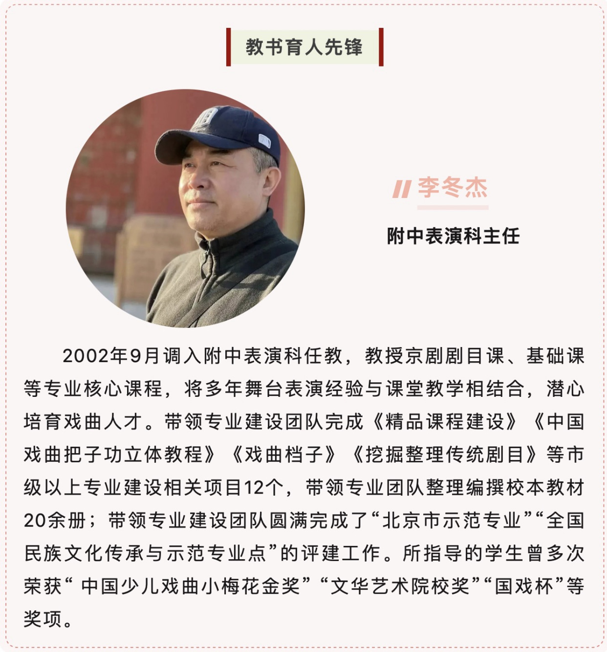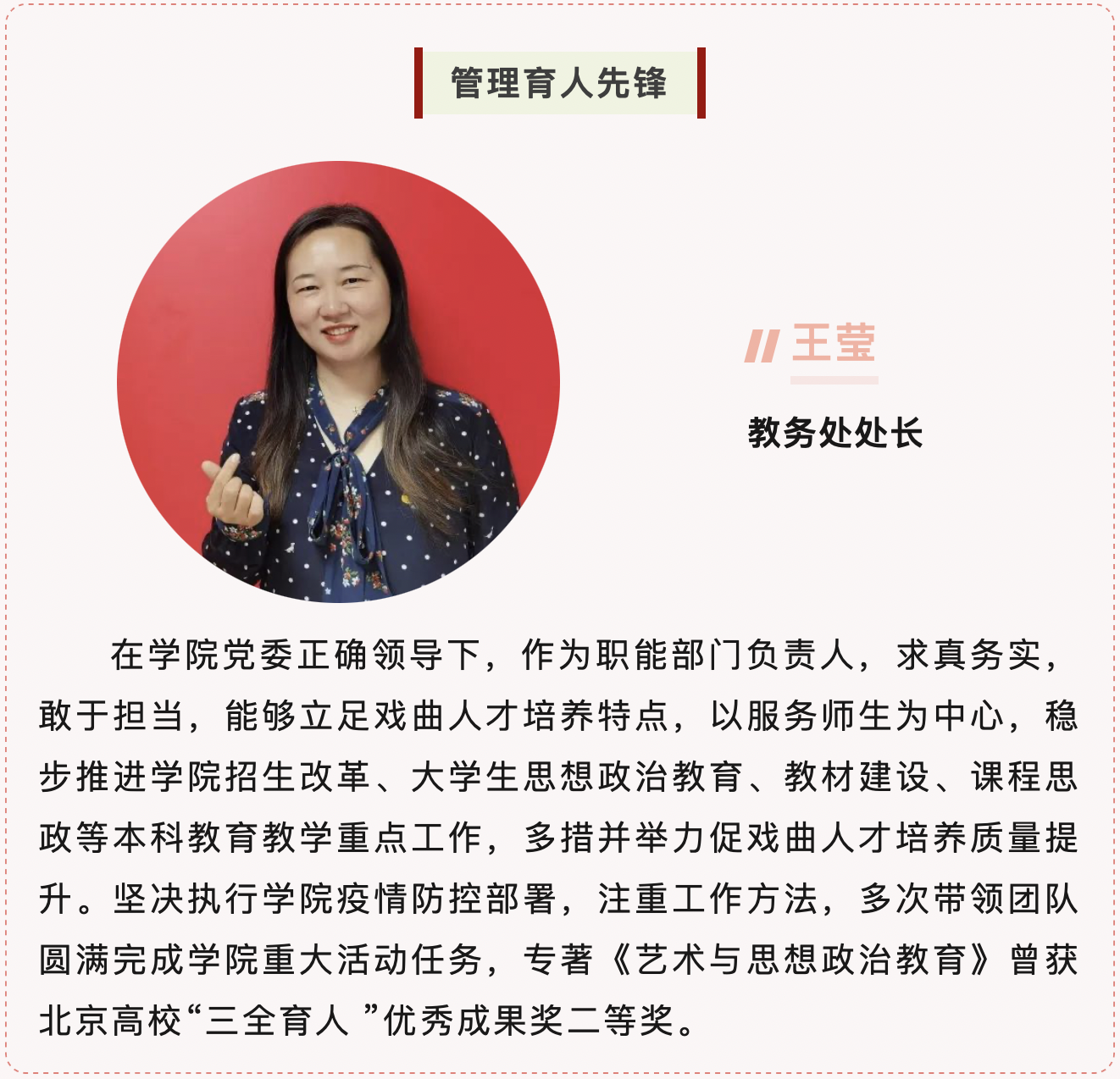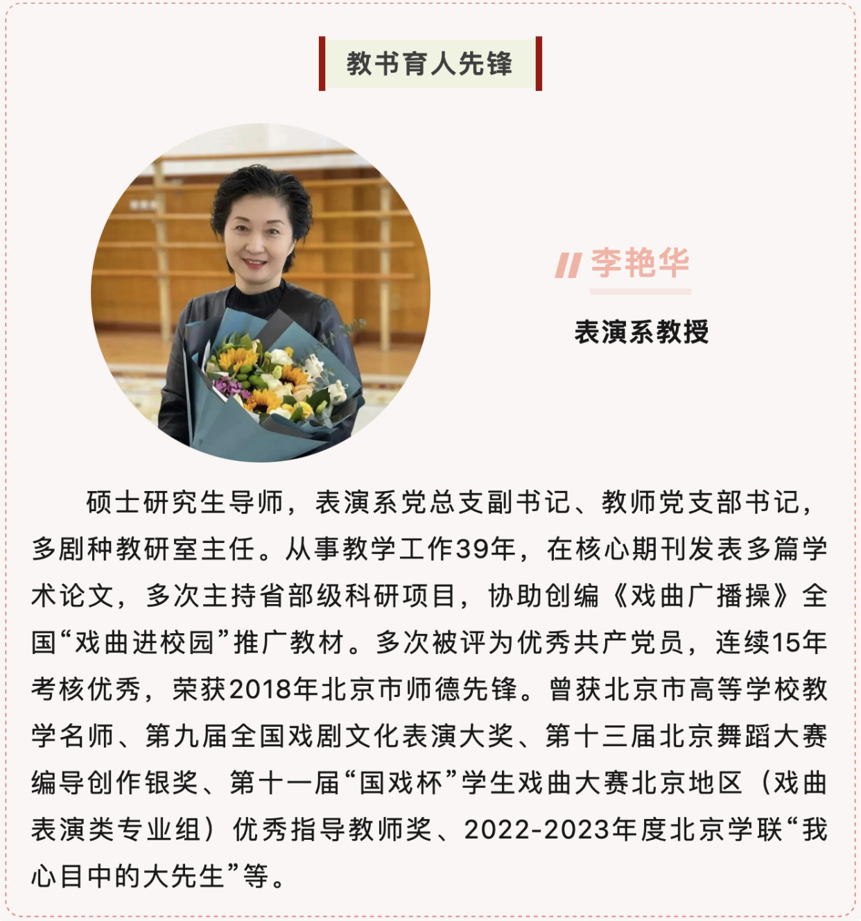 近日,北京市教育系统“育人榜样(先锋)”推荐结果揭晓,我院表演系教授李艳华荣获“教书育人先锋”(高校组)。教务处处长王莹,教师工作部部长、人事处处长、教师发展中心主任姚海琳荣获“管理育人先锋”,信息网络中心主任、图书馆馆长岳从远,学生工作部副部长(主持工作)渠岩荣获“服务育人先锋”。附中表演科主任李冬杰荣获“教书育人先锋”(普教组)。