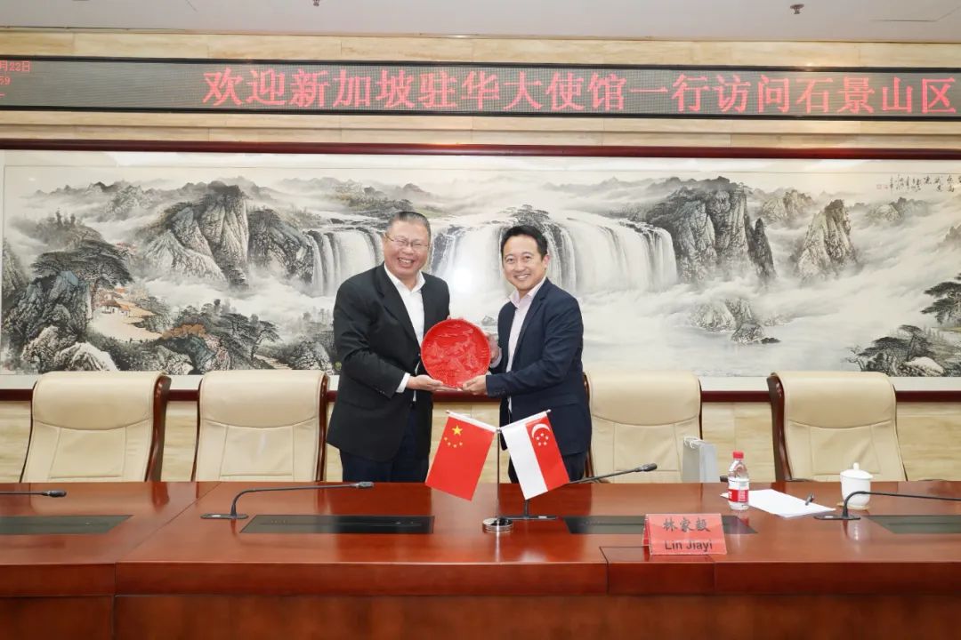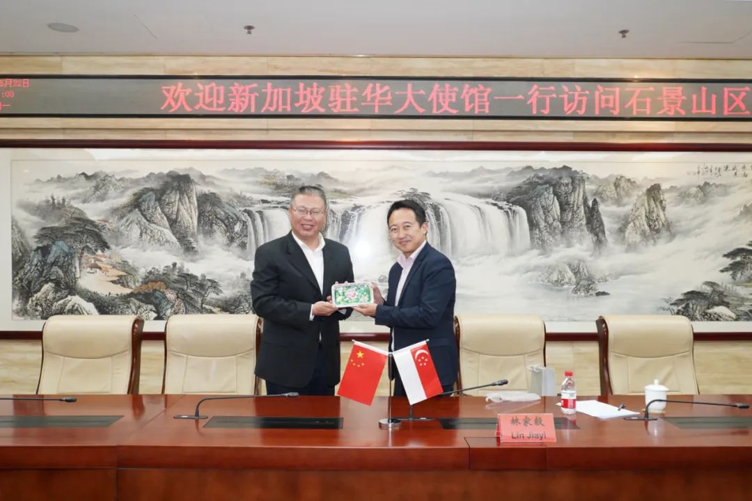 最后,李新代表石景山区与新加坡驻华大使馆互相赠送了纪念品。