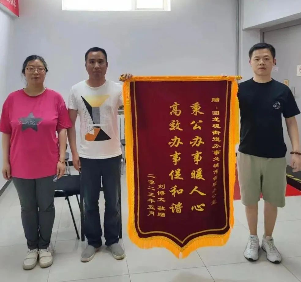 为感谢回龙观街道的热心帮助,市民于5月16日为街道城市管理办送来了写有“秉公办事暖人心,高效办事促和谐”的锦旗。