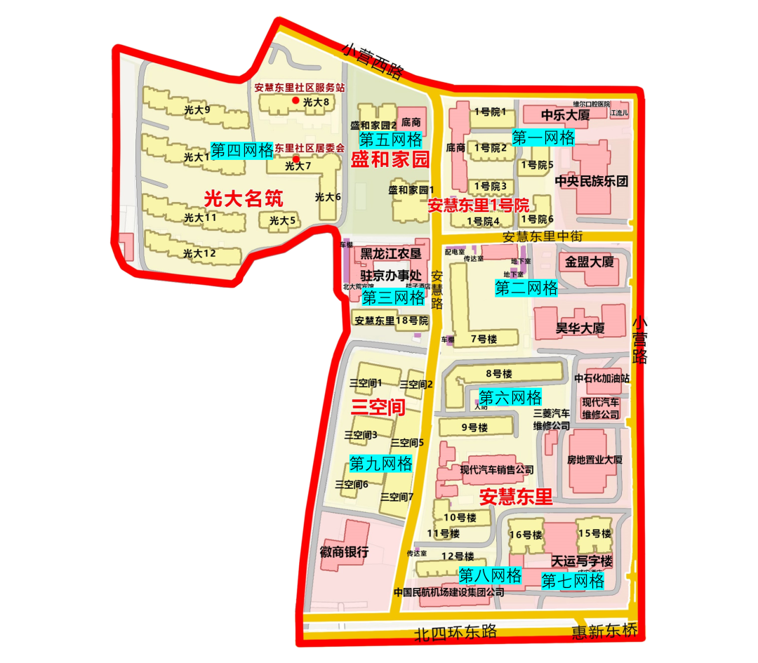 安慧东里社区位于大屯街道南部,面积0.37平方公里,现有居民楼32栋,总户数3400余户,常住人口7000余人,商务楼宇4座,辖区单位99家。社区自管党员383人,在职双报到党员270人,党建协调委员会成员单位25家。