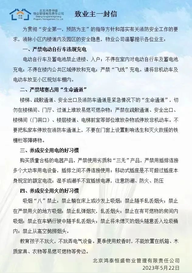据了解,鸿泰恒盛物业、孙河物业旨在通过居民微信群+入户宣传的形式,号召居民积极践行文明行为,共建共享平安家园。截至目前,共印制发放《致业主一封信》12000份。