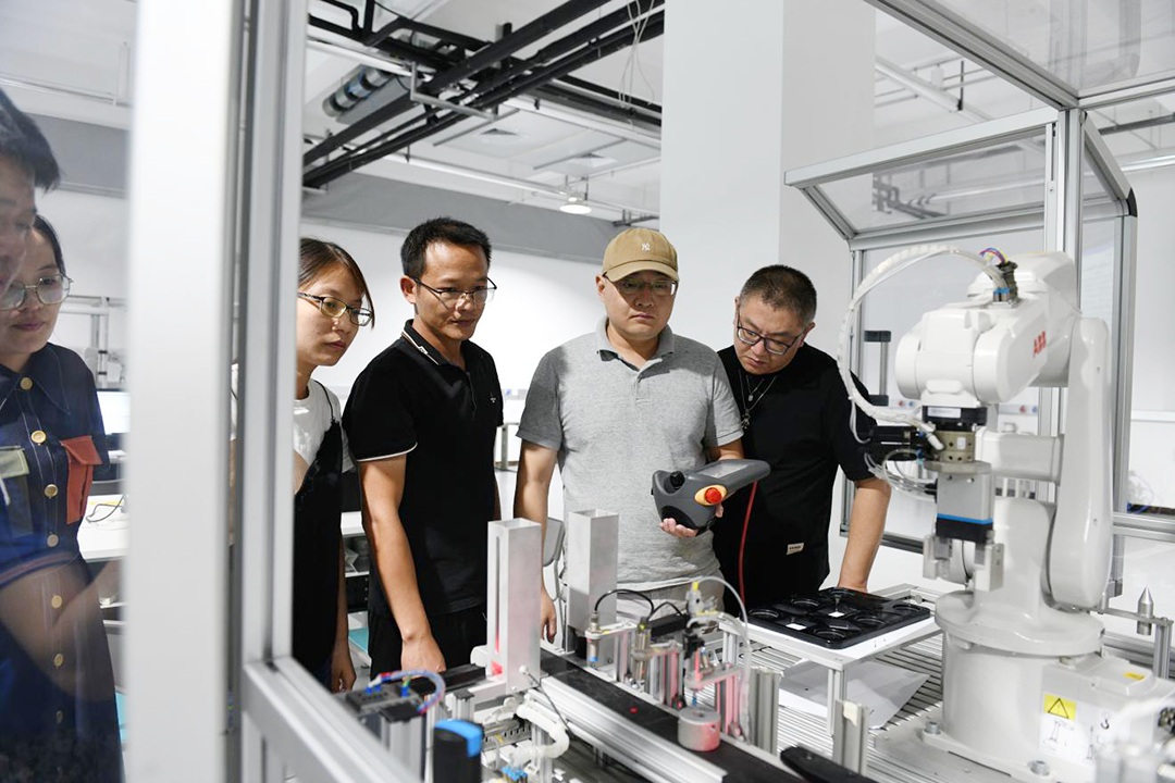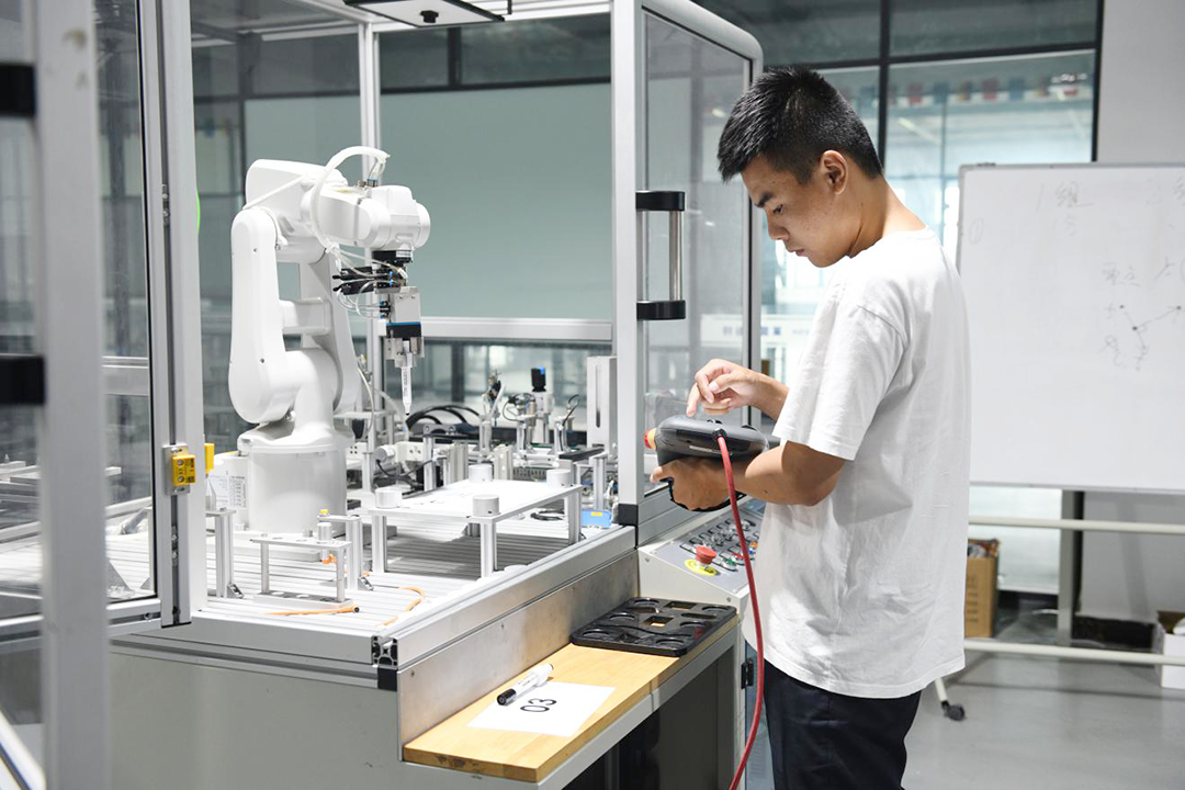 企业班学员进行工业机器人示教实操。