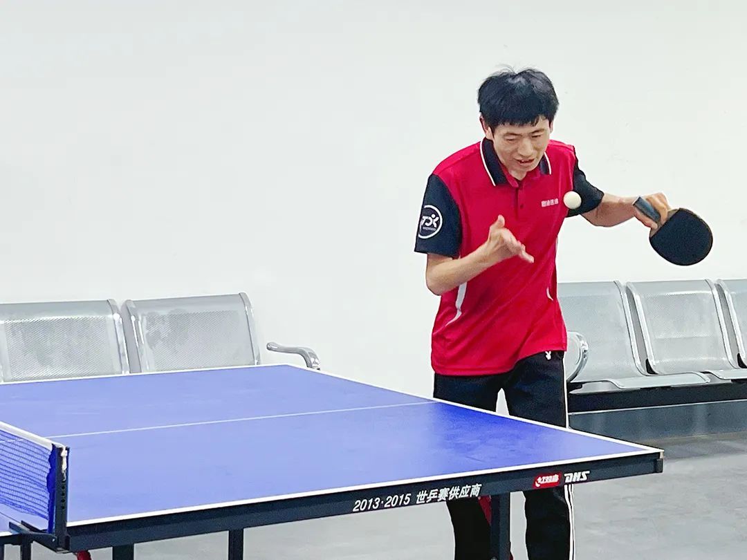 工作之余,荣富和同事通过打乒乓球强身健体。