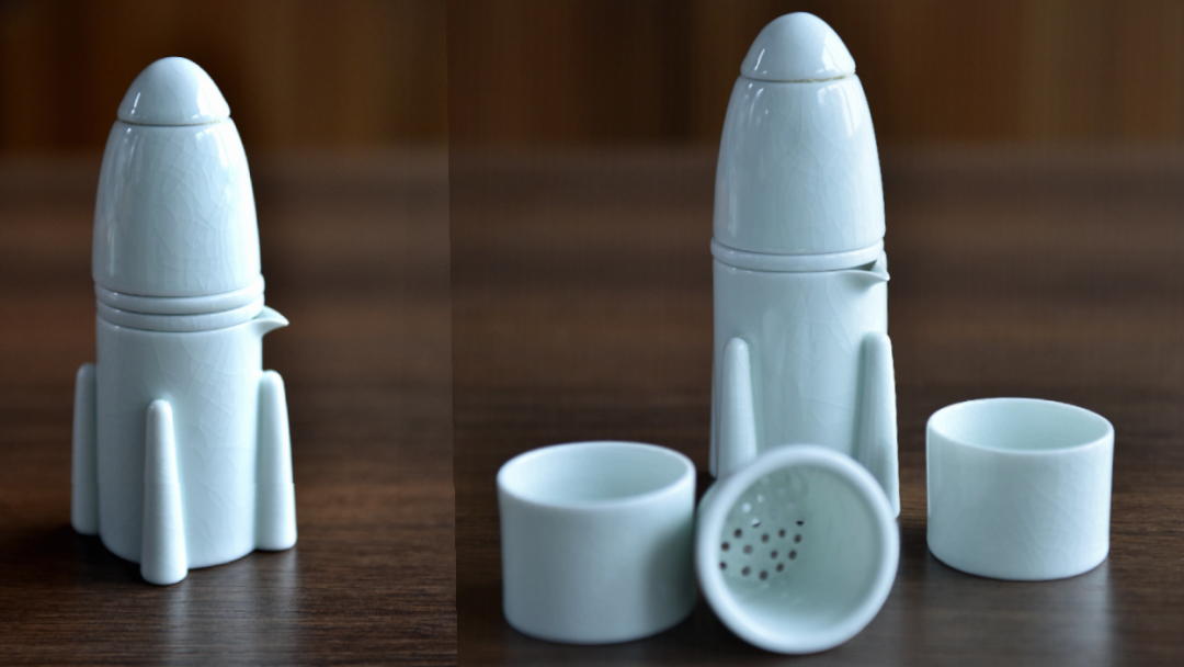 众智诚橙与航天文创以“航天火箭”为造型,打造的“汝瓷‘梦飞天’茶具套装”。