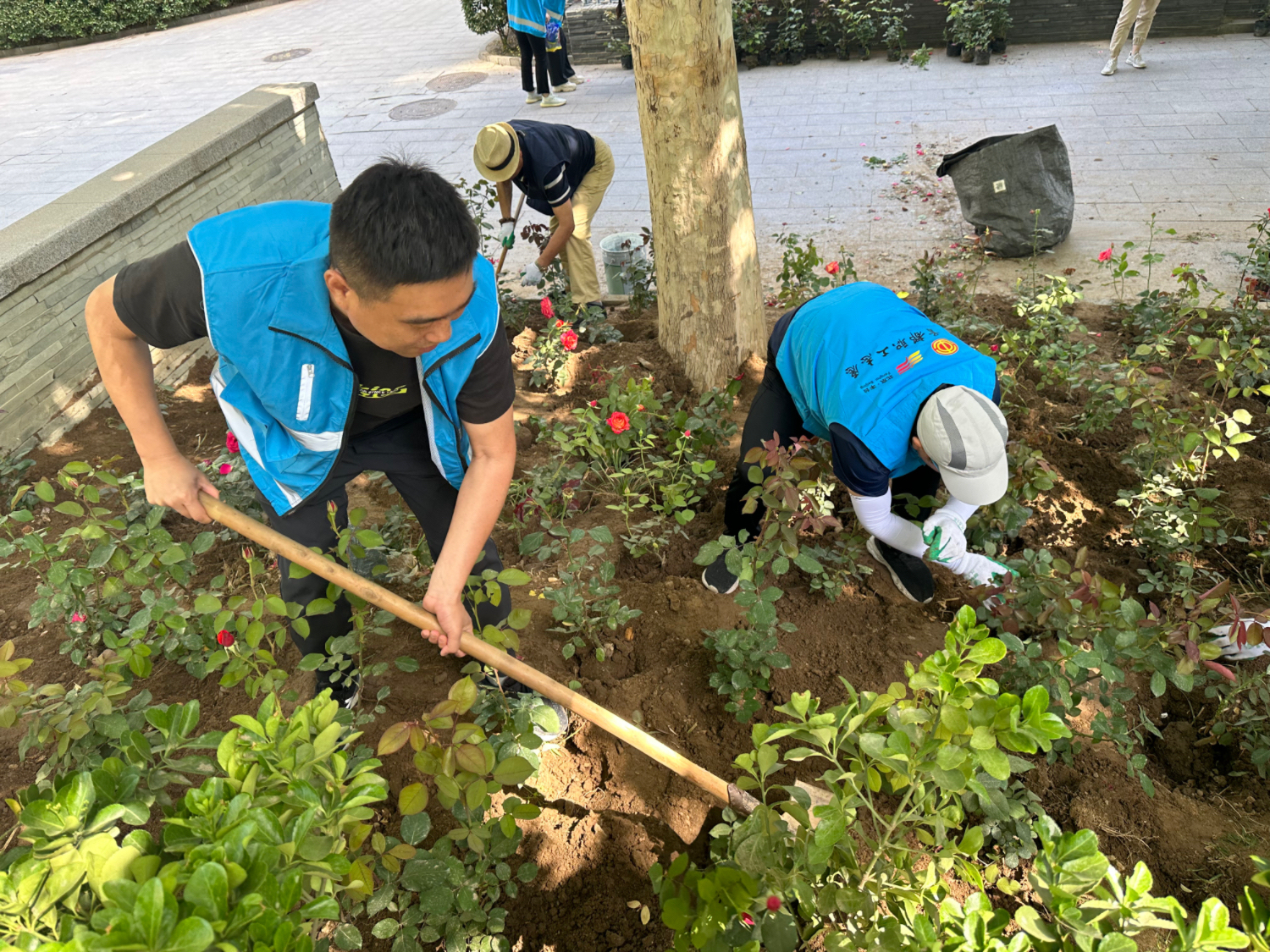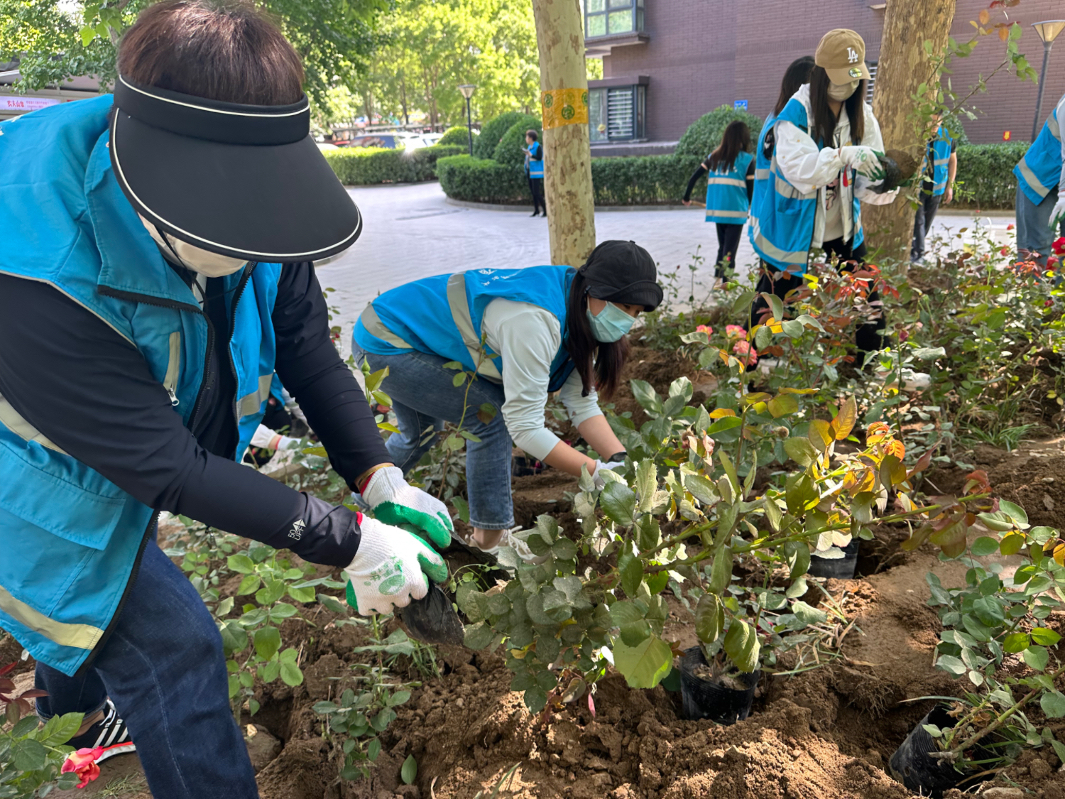 活动当天,大家带着水桶、铁锹等工具来到小区内开展志愿服务活动。全体人员分工明确,翻地、摆花苗、浇水,相互配合默契,在花园内种下了400多株鲜艳美丽的月季花苗,在一铲一锄中感受为居民办实事办好事的快乐。