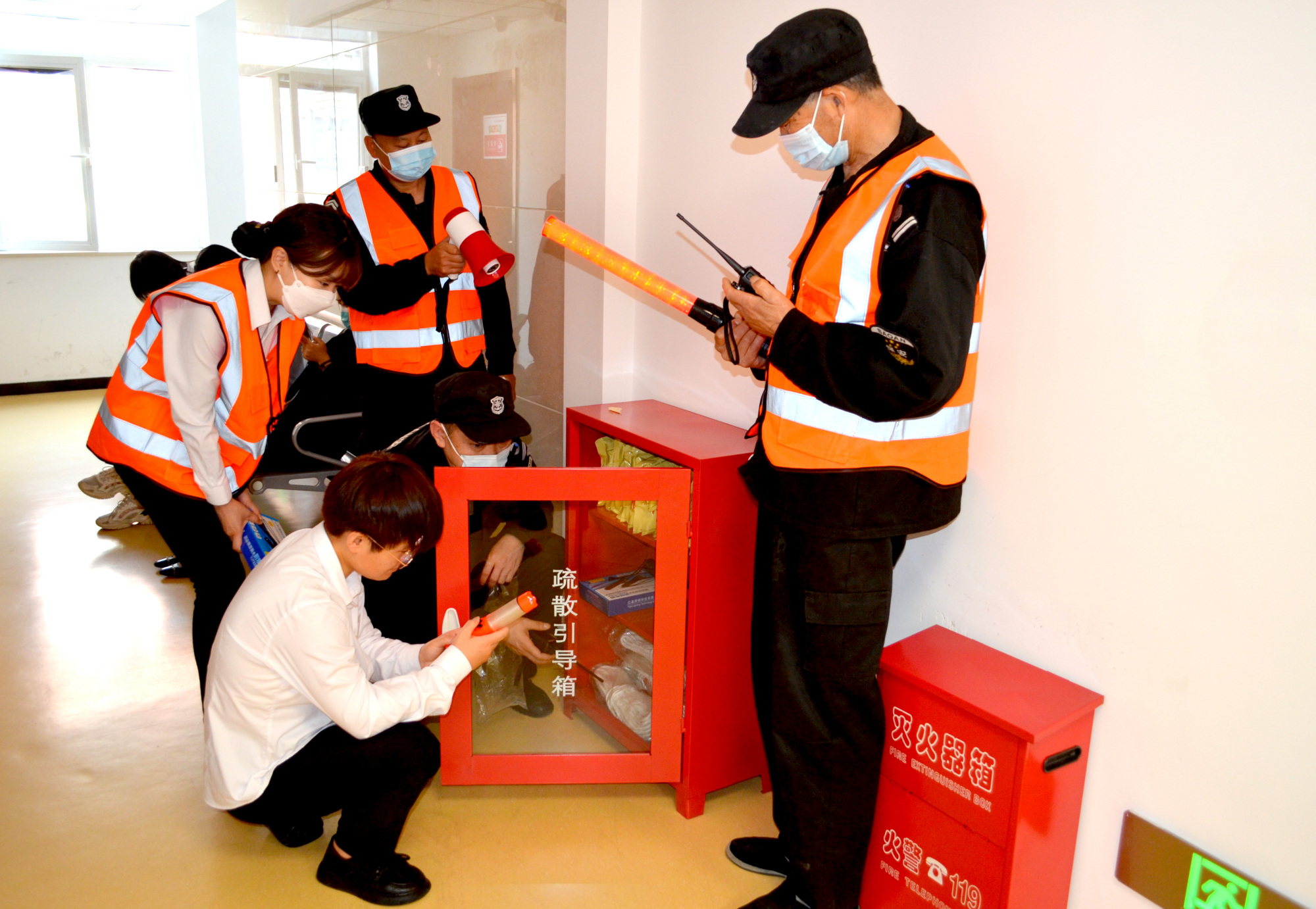 ▲在大厅新设置的疏散引导箱,工作人员在熟悉相关的消防物品。