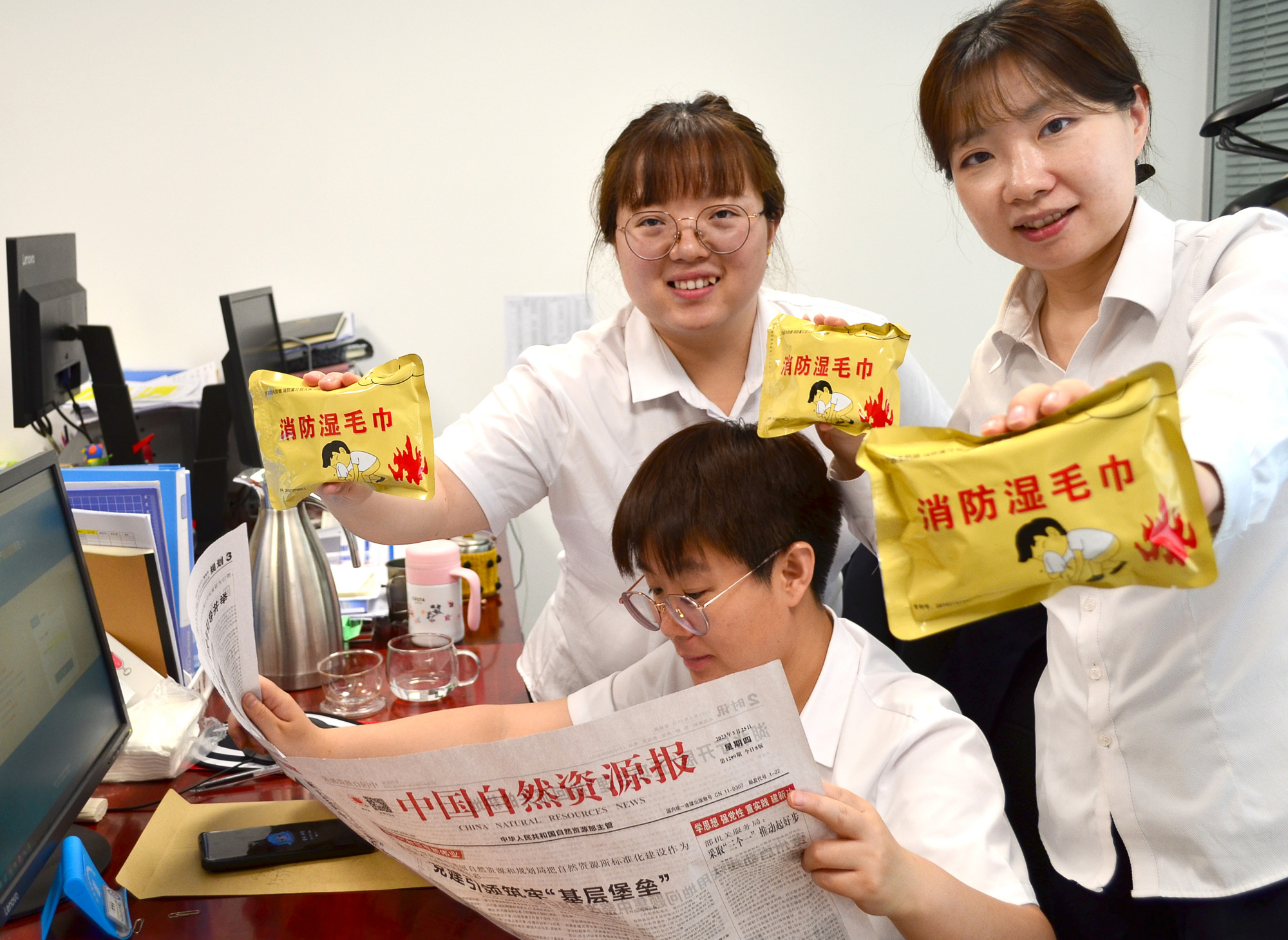 ▲工作人员展示刚刚发放的消防湿毛巾。