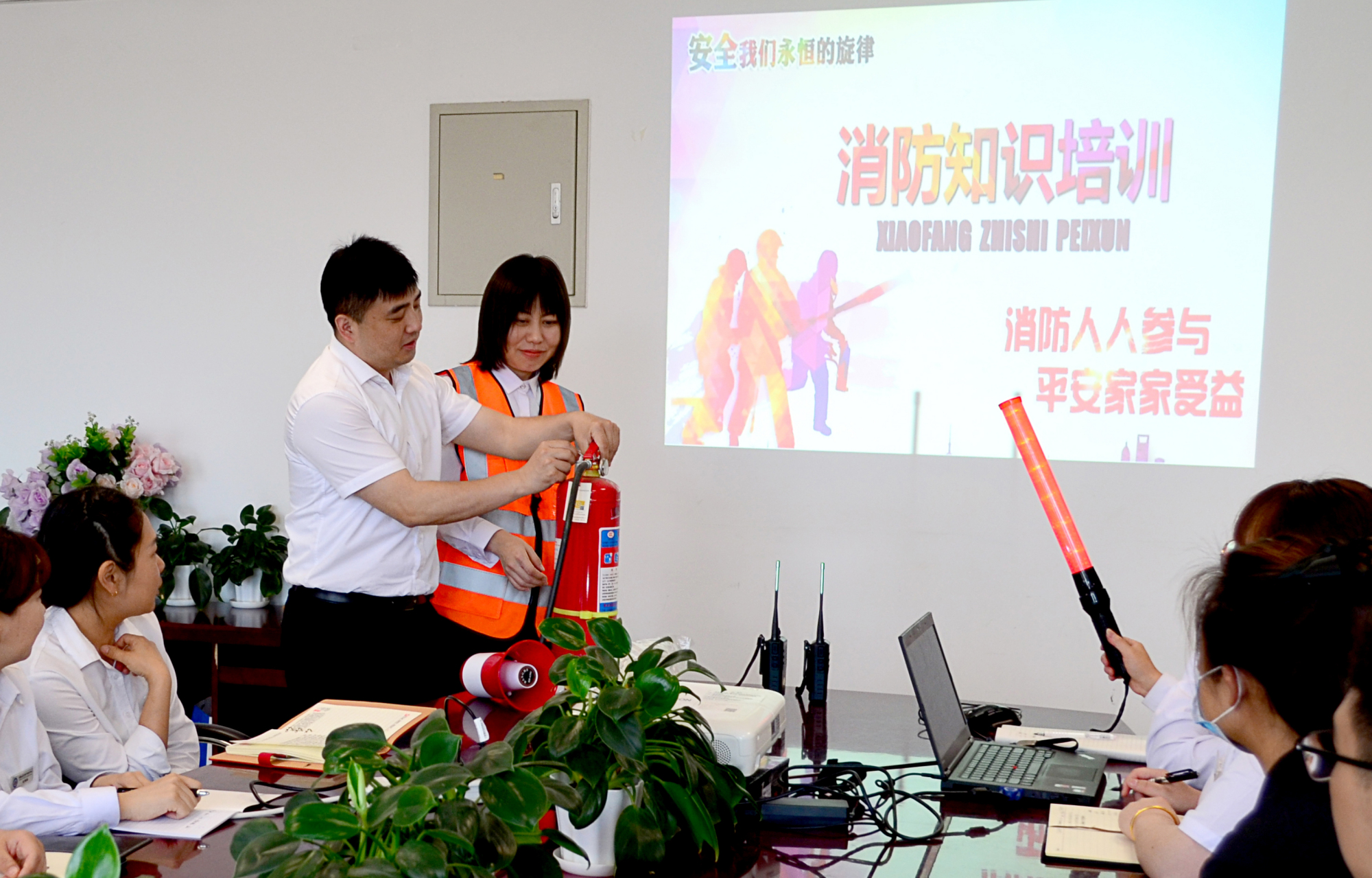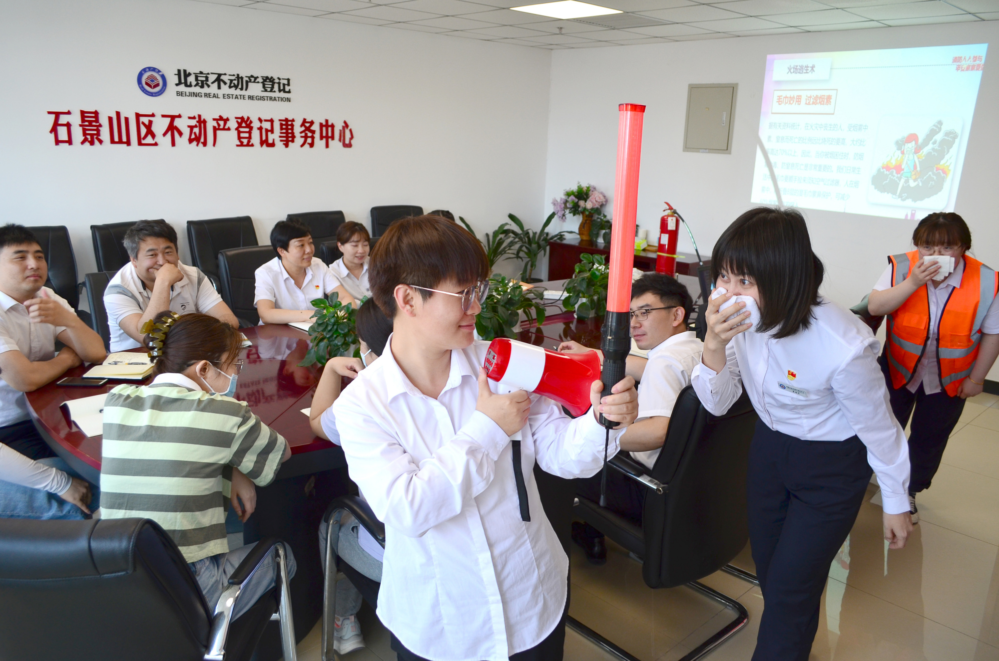 ▲消防知识培训现场,工作人员演练火灾转移情景。