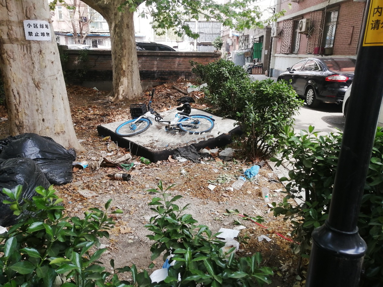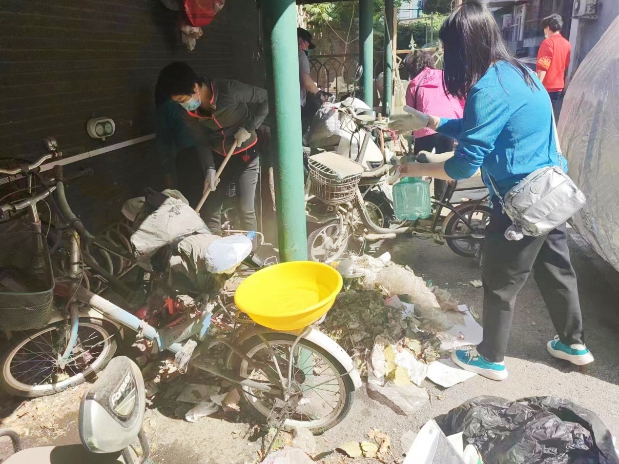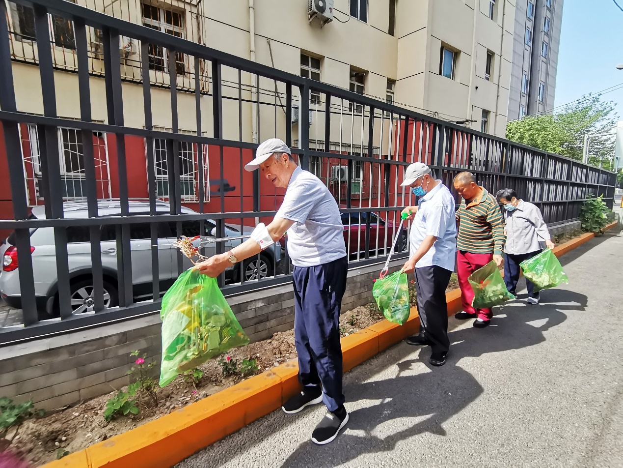 在清理过程中,社区把大家分成青年组和老年组,老年组负责绿化带中白色垃圾捡拾,青年组负责自行车棚及楼前屋后卫生死角里的大件垃圾清理。
