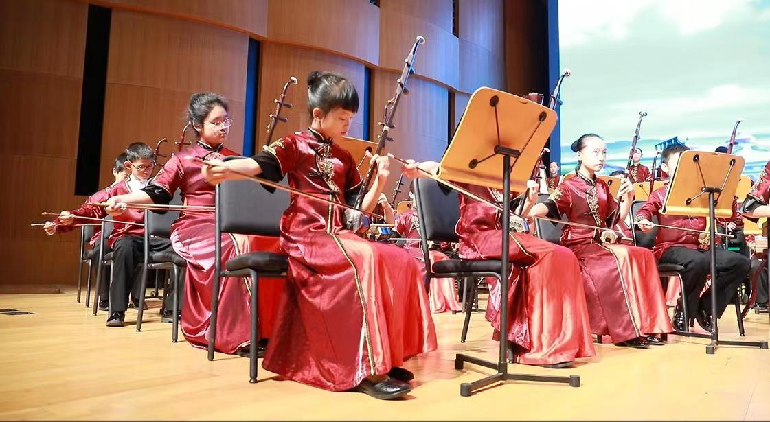 座无虚席的音乐厅内,馨星民族乐团的孩子们为观众们表演了七首风格迥异、体现多彩民族特色、彰显悠久灿烂中华优秀传统文化精髓的民族管弦乐合奏曲。一拨一弹间,意蕴深长;一敲一打中,酣畅淋漓;一吹一拉时,回味无穷……学生用激昂的器乐合奏演绎与艺术的情缘,用实力追寻对艺术的热爱,彰显出少年蓬勃向上的精神风貌。