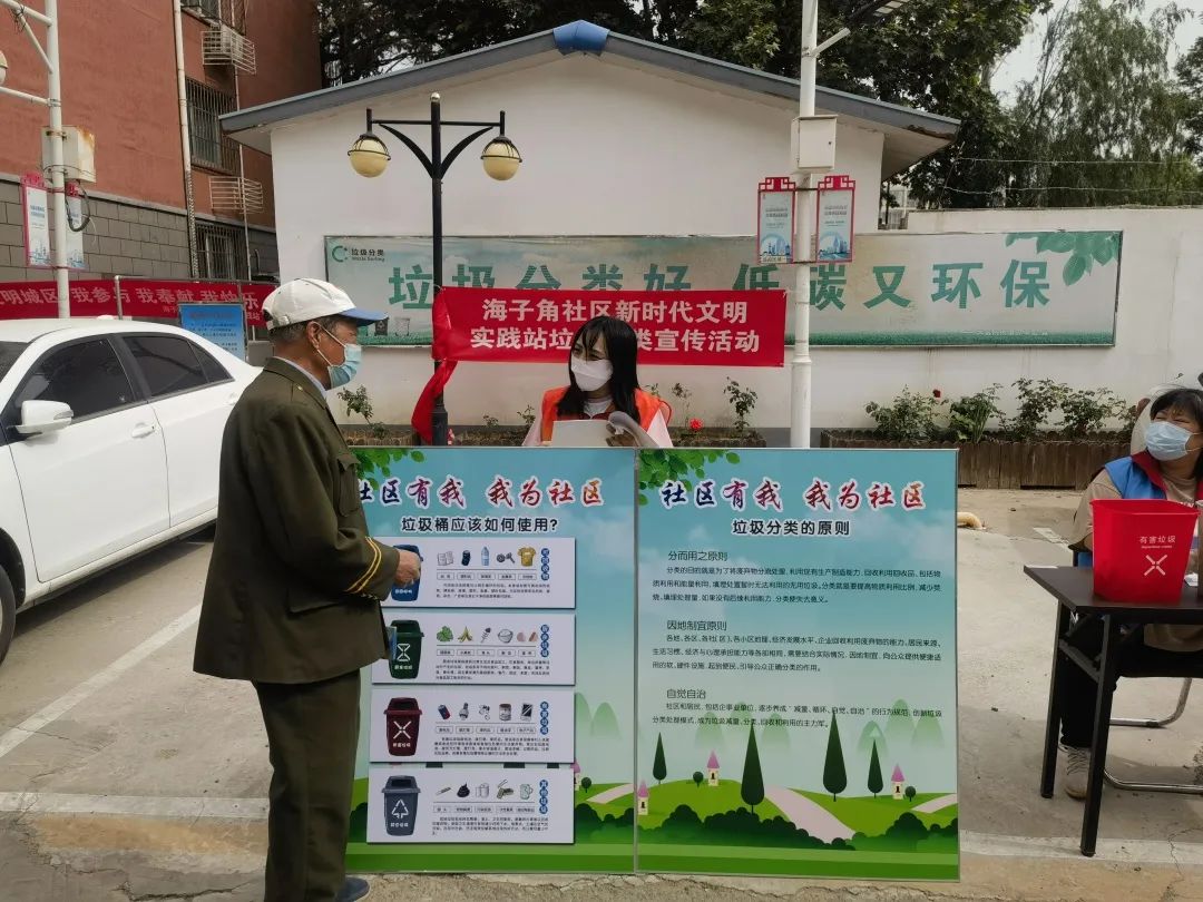 海子角社区在小区内开展了一场别开生面的邻里节垃圾分类宣传活动。通过垃圾分类宣传、趣味问答和正确投放三个环节,配合社区志愿者利用生动有趣的讲解、问答,让居民明白了垃圾分类的重要意义。