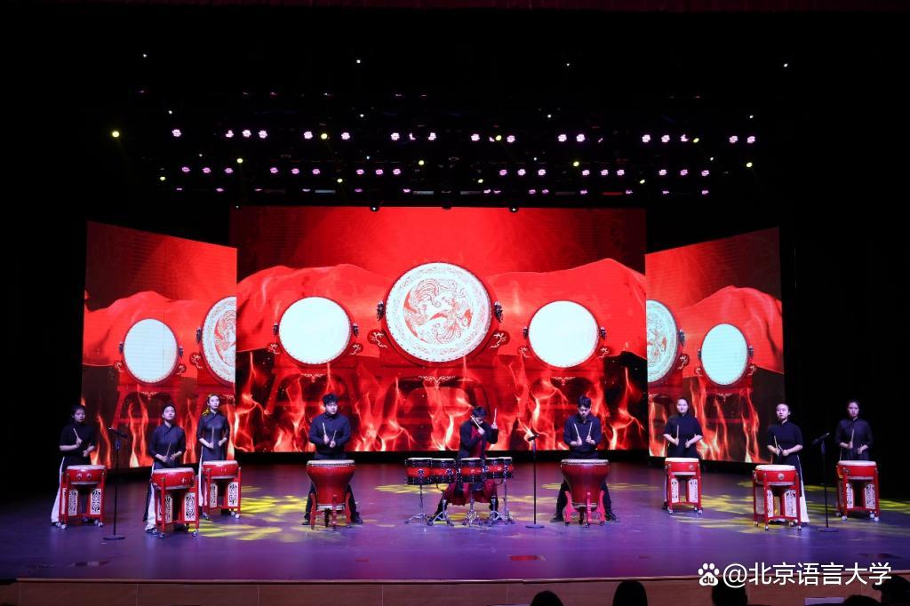 北京语言大学打击乐团带来打击乐合奏《龙腾虎跃》,带有强烈节奏感的鼓声将会场氛围点燃。