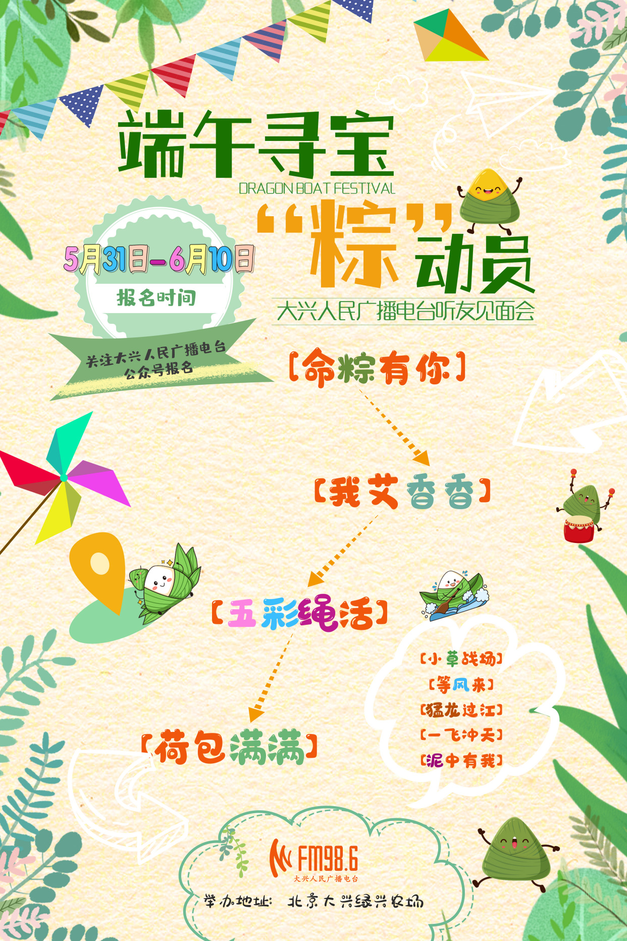 5月31日,大兴人民广播电台FM98.6发布端午寻宝“粽”动员暨大兴人民广播电台听友见面会海报,向所有满怀期待的听众朋友发出邀请:6月17日,在北京大兴绿兴农场,一段别开生面的传统文化“寻宝”之旅即将开启,听友可以关注大兴人民广播电台公众号进行报名,与精彩活动、神秘“宝藏”,尤其是喜欢的节目主持人约定这场双向奔赴的夏日盛会。