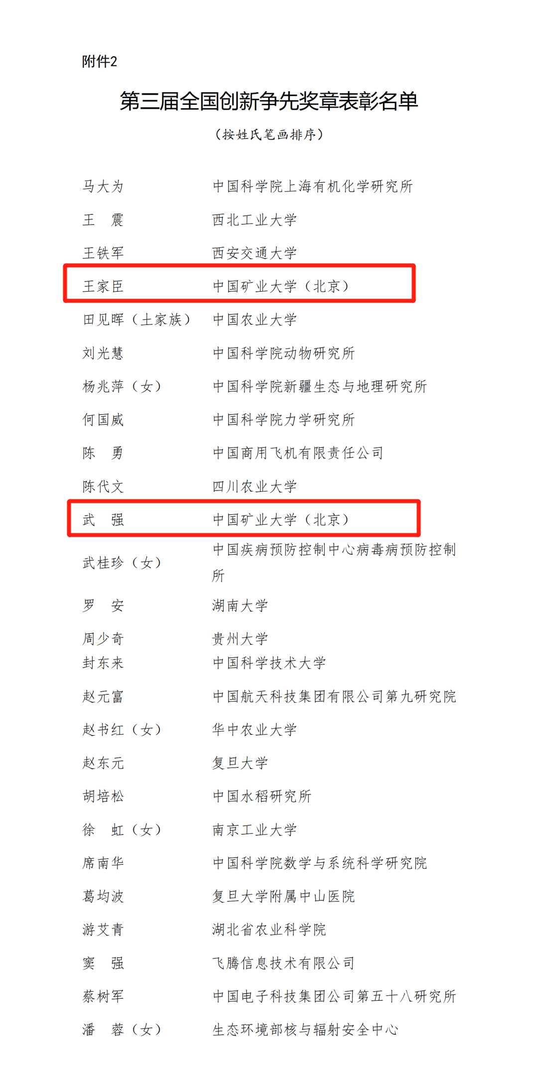 5月30日,是中国第七个全国科技工作者日,第三届全国创新争先奖表彰大会在北京举行。表彰大会上授予7个团队全国创新争先奖牌,授予26名同志全国创新争先奖章,授予251名同志全国创新争先奖状。中国工程院院士、中国矿业大学(北京)教授武强,中国矿业大学(北京)教授王家臣荣获第三届全国创新争先奖章。