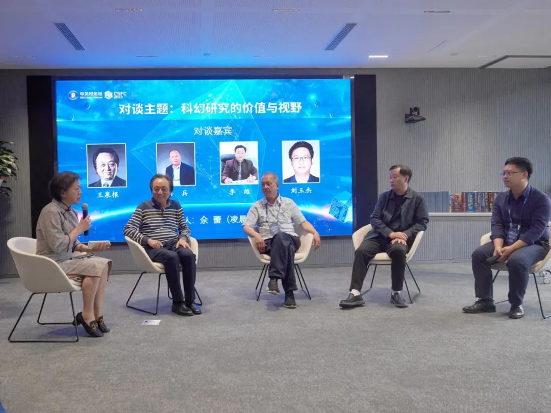 北京师范大学文学院教授、博士生导师王泉根,清华大学社会科学学院科学技术与社会研究所教授、中国科协——清华大学科技传播与普及研究中心主任刘兵,《齐齐哈尔大学学报(哲学社会科学版)》主编李维,中国科学技术出版社有限公司与清华大学联合培养博士后刘玉杰,以“科幻研究的价值与视野”为题进行对谈。本环节由科幻作家凌晨主持。