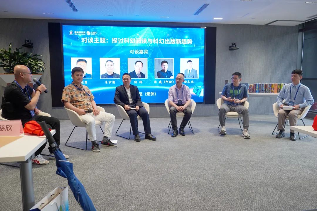 北京书香文雅图书文化有限公司董事长李继勇,资深媒体人、科幻作家朱宇清,少儿科幻作家陆杨,青年科幻作家阿缺,高校科幻平台负责人赵文杰围绕“探讨科幻阅读与科幻出版新趋势”的主题进行对谈,对谈环节由少儿科幻作家超侠主持。