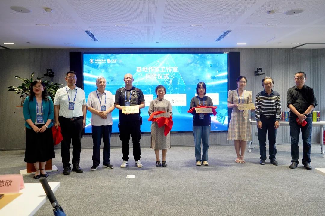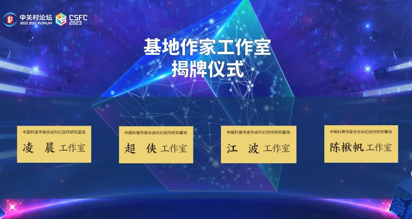 会上,举行了基地作家工作室揭牌仪式。中国科普作家协会副理事长尹传红,北京师范大学文学院教授、博士生导师王泉根,中国科普作家协会科幻创作研究基地主任王晋康,北京元宇科幻未来技术研究院院长刘慈欣,中国科学技术出版社有限公司副总编辑赵晖,为凌晨工作室、超侠工作室、江波工作室和陈楸帆工作室揭牌。至此,科幻基地已经为14位作家成立了工作室。