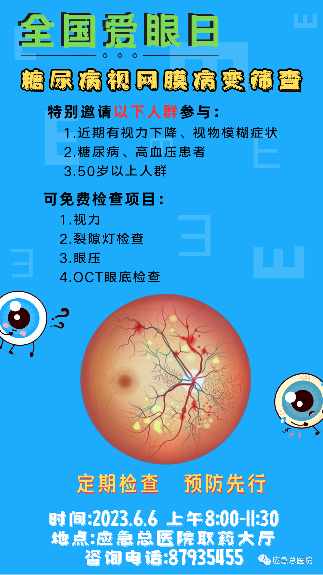 为了造福广大患者,应急总医院眼科于6月6日(周二)上午开展公益义诊活动,重点对糖尿病视网膜病变患者免费进行筛查,欢迎大家前来咨询、检查、体验。