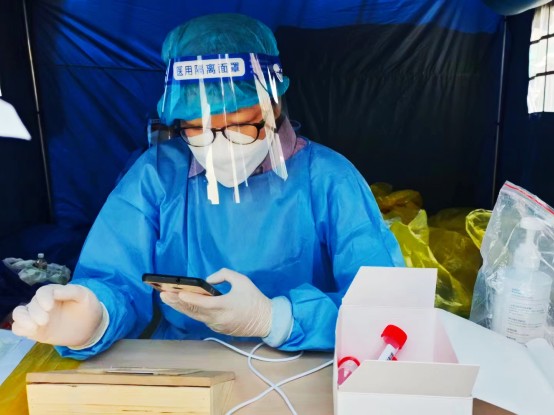 2022年,丰台区开展区域化核酸检测工作,连颖白天坚守在核酸检测点位,晚上在小区卡口值守。连颖和她负责的流调小组每四天一个夜班开展电话流调工作。在人员调配不开时,她就叫来放假在家的女儿和居家办公的爱人帮忙。2022年11月,社区计划成立一支追阳管小组,连颖第一时间报名,每天入户为混阳管居民做抗原检测。这期间,每日平均两万步,累计爬楼100层,是连颖当时的常态。