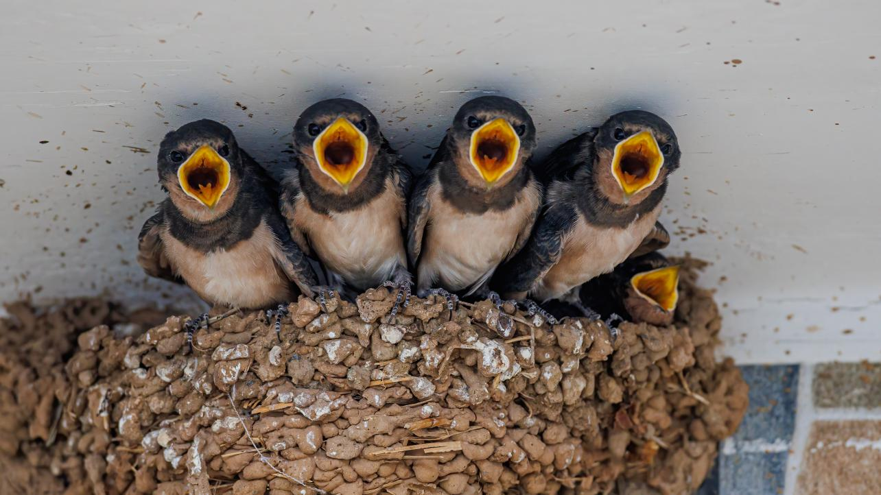(看到妈妈飞回来,家燕宝宝全部张开大嘴,仿佛在说“妈妈给我,妈妈给我”)