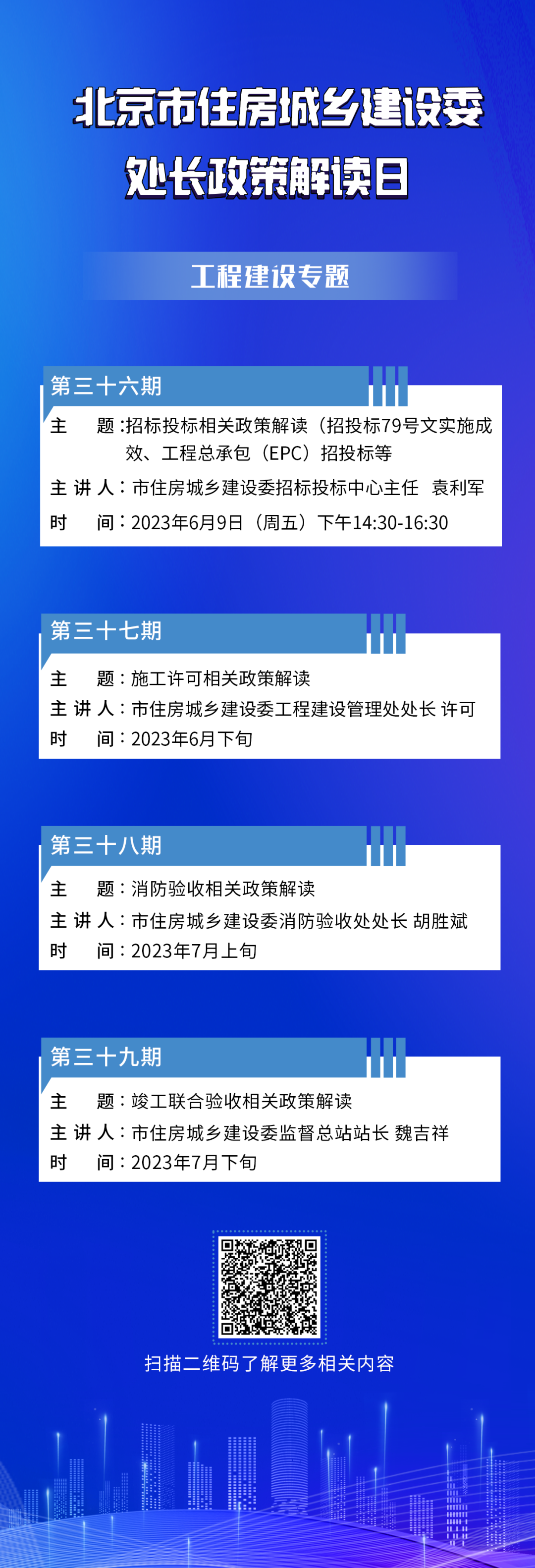 第三十六期“处长政策解读日”将聚焦招投标79号文实施成效、工程总承包(EPC)招投标政策进行解读,线上线下同步举行,想参加活动的企业请扫描下方二维码报名!(因会场原因,此次报名限定不超过60位企业代表现场参会,欢迎各位企业代表通过腾讯会议线上参会,报名截止日期2023年6月7日下午17:30)