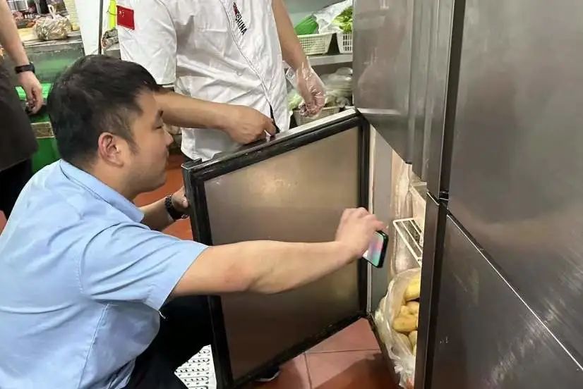 在厨房后厨,检查组对环境卫生、食品原料采购贮存情况、餐饮具清洗消毒等进行详细检查。