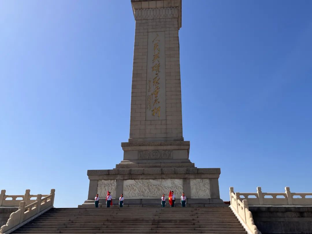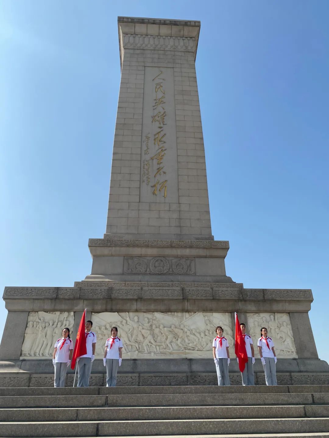 站岗当日,东城区少先队员们身着整洁的校服,胸前系着鲜艳的红领巾,戴上崭新的白手套,高擎中国少年先锋队队旗,迈着整齐而坚定的步伐,保持庄严肃立,列队走上人民英雄纪念碑北侧。