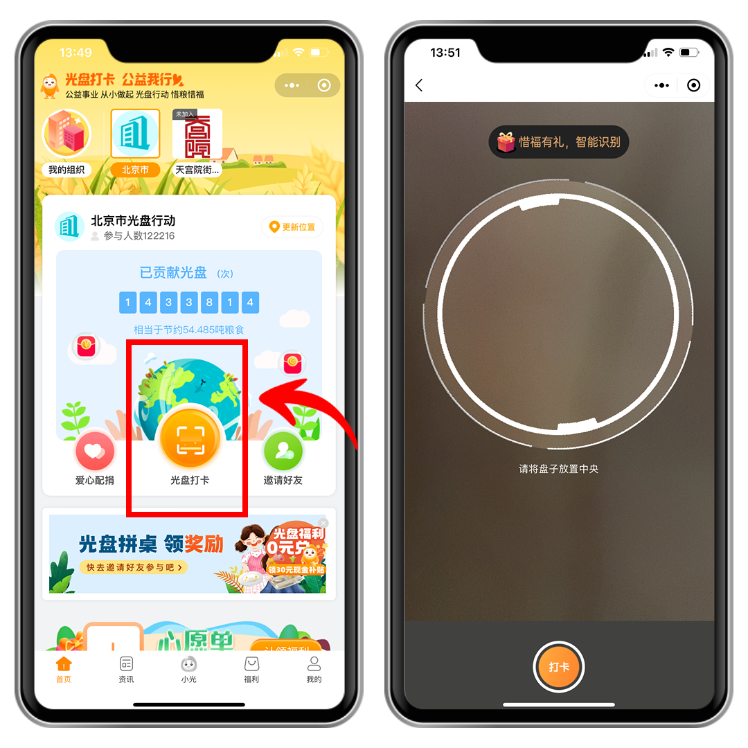 返回首页,点击“光盘打卡”,将空餐具放入圆框内拍摄,识别后打卡成功,如打卡失败可以调整一下光线和角度
