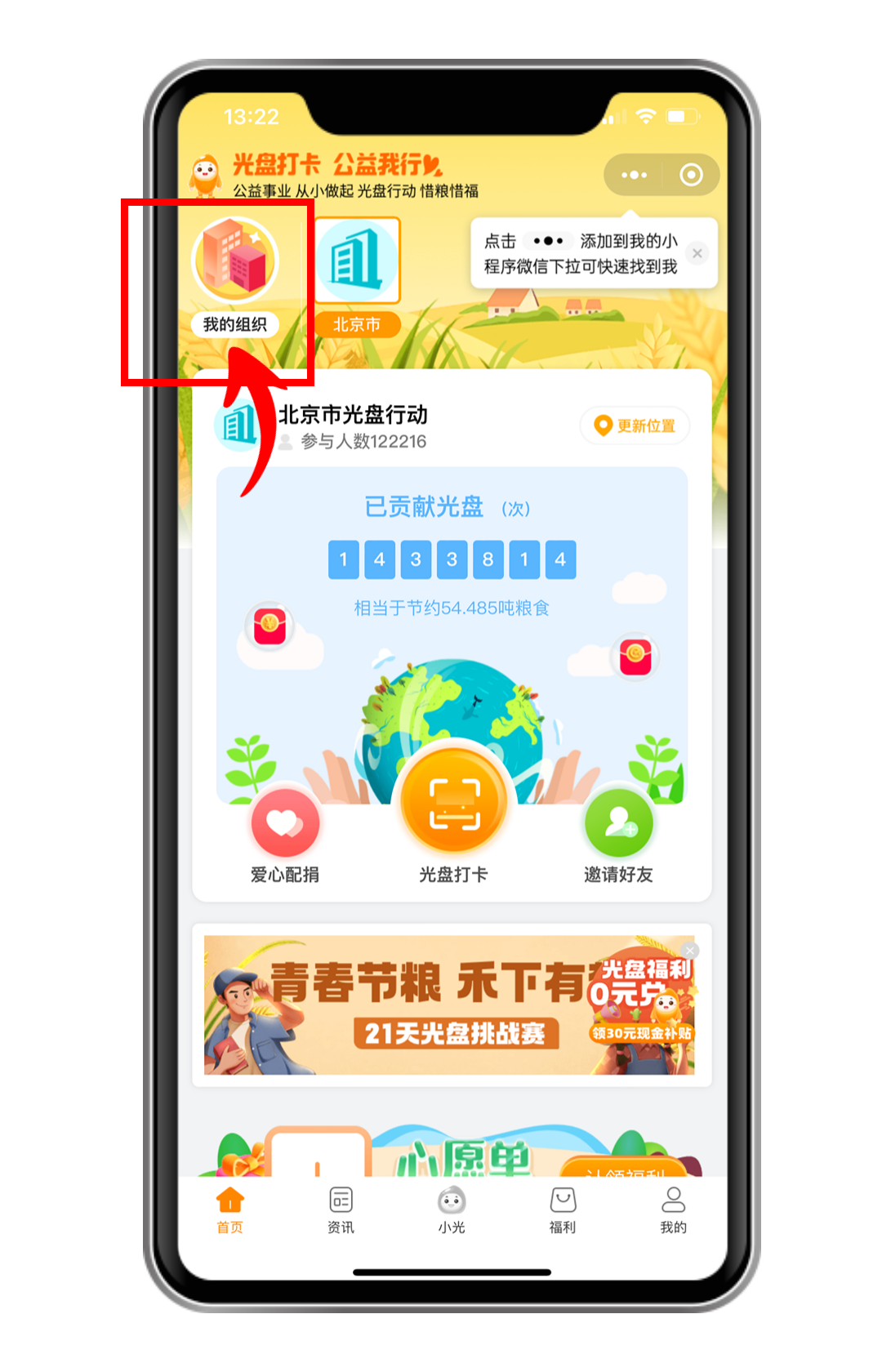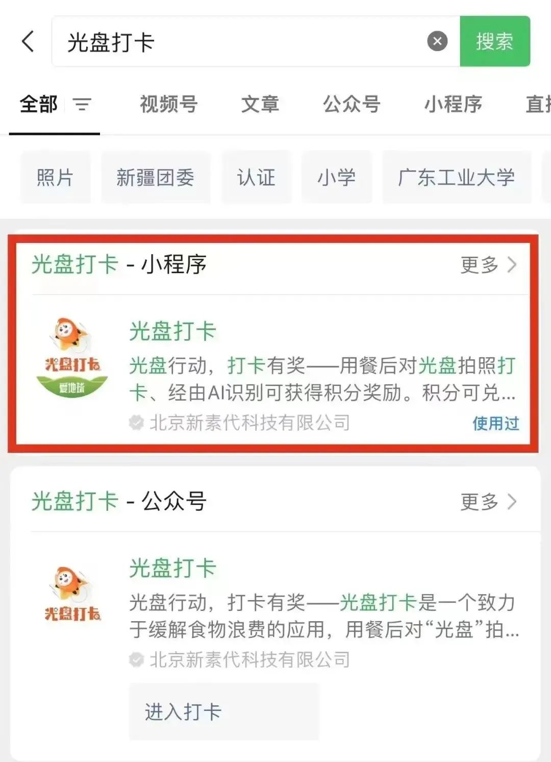 微信下拉小程序,搜索“光盘打卡”,直接进入