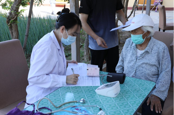 对一些久病卧床且生活不能自理的老人,医务人员还主动走到房间,询问其相关病史及用药情况,同时将专业的医疗护理知识讲解给养老院的工作人员,以便他们更好地照顾老人。来自爱侬养老照料中心68岁的董雁伶说:“我是今年3月住进这里的,第一次参加这里的体检,感觉医生检查挺细致的,大夫和工作人员都很负责。”