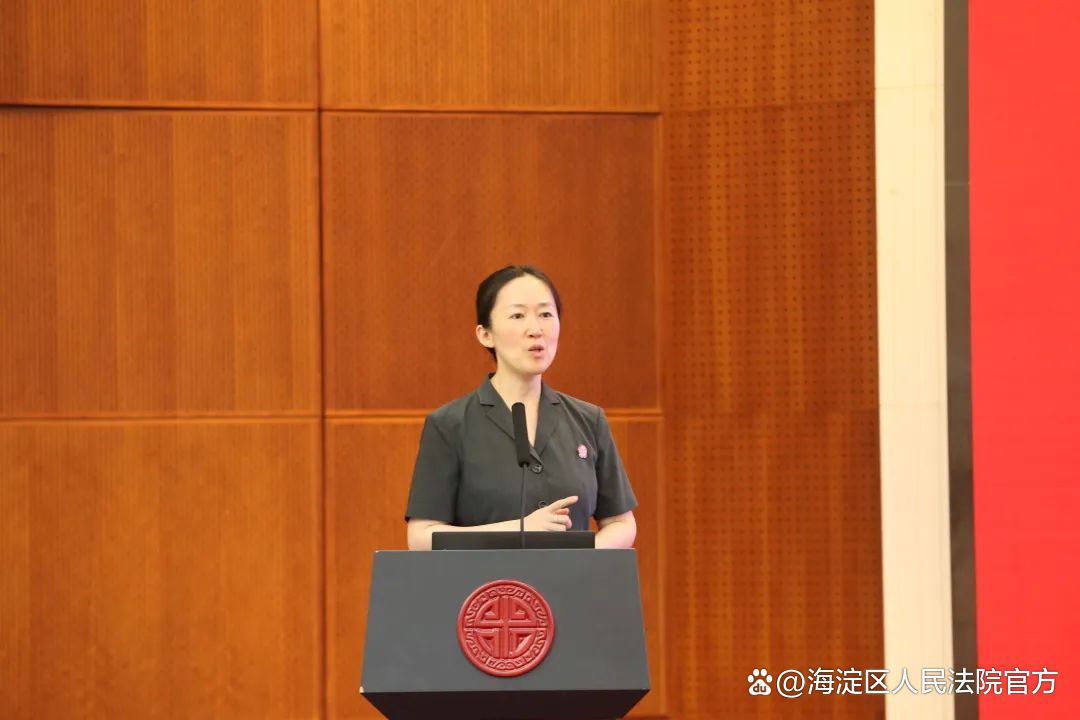 模拟法庭结束后,海淀法院少年法庭负责人秦硕以《“小”法“大”世界》为主题,为同学们带来一节生动的法治课。秦硕向同学们展示了海淀法院少年法庭的独特设计。淡黄色的审判桌椅、浅蓝色的墙面、U形法台等都寓意着包容、接纳、关怀,像一个张开的怀抱,无形中保护着每一个走进法庭的孩子。