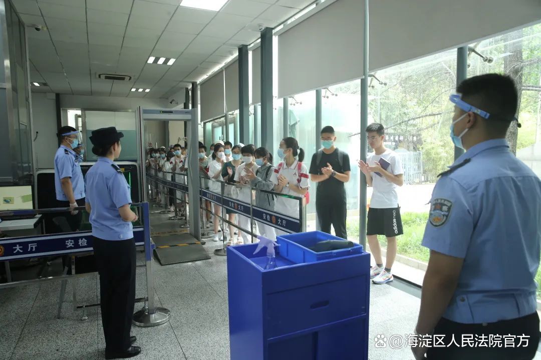 走进海淀法院的大门,同学们首先来到安检大厅。海淀法院安检人员为同学们介绍了当事人来到法院进行安检的流程和步骤、严格安检的重要性以及进入法院的注意事项等问题。