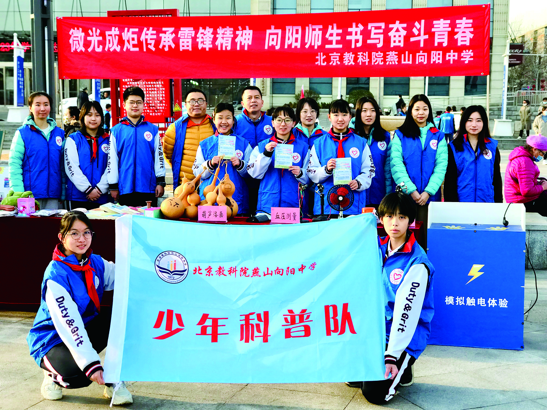 向阳中学注重充分利用社会资源,开展科技科普活动。学校提倡学生在动中学,在用中学,培养具有真、善、美品质的未来科技人才。以学生“动口说”为起点、以学生探索科学奥秘的求知欲为引领,通过科普知识讲座、科普论坛、科学知识竞赛等方式,向阳中学师生合作成立学校少年科普队,积极开展学生科技科普活动。遵循“走出去”——走进社区进行科普宣传、参加社会活动展示科技魅力,“请进来”——邀请科普专家入校讲座、实地指导科普实验原则,形成双向互动,促进学校科技活动良性循环发展。