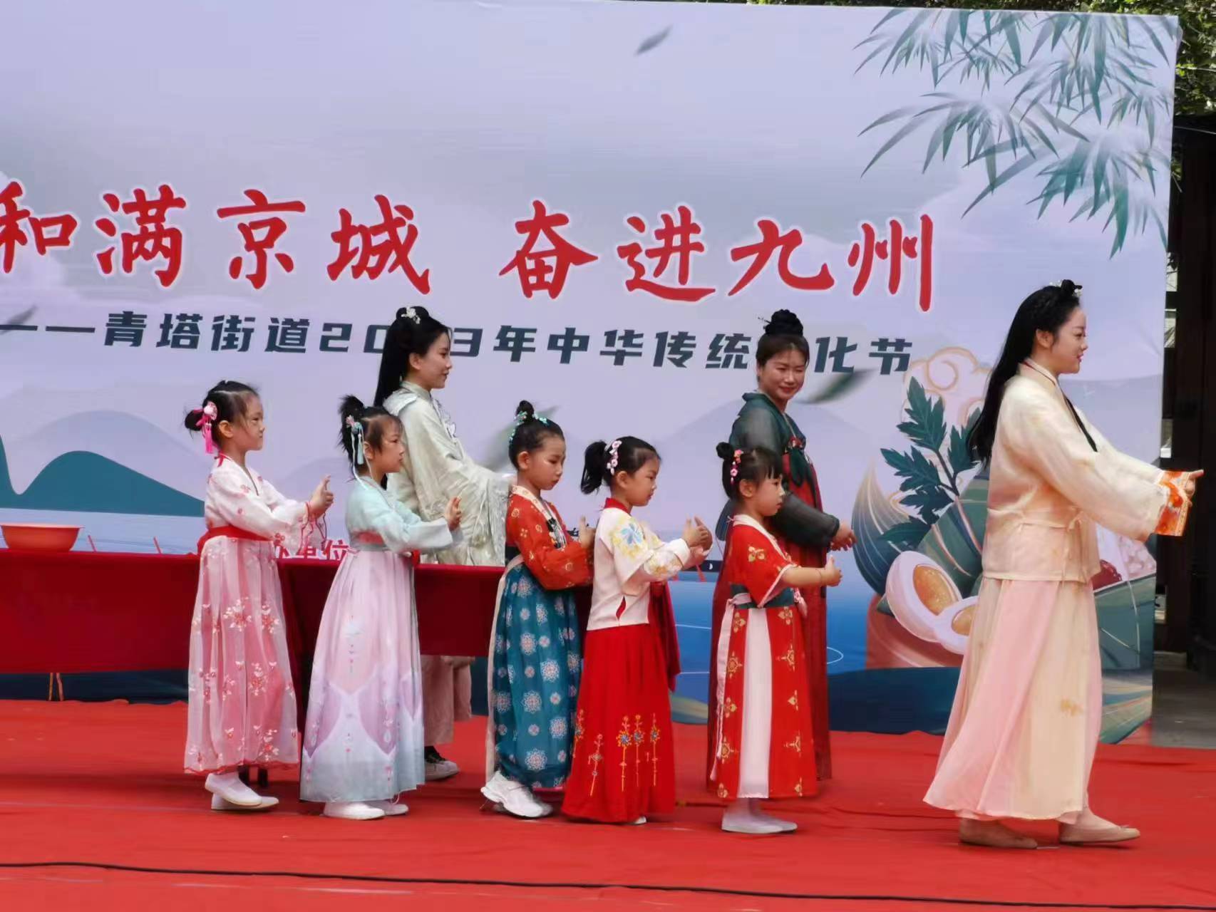 听,二胡、唢呐、古筝……古典的音符,带着时间的沉淀,凑成了一首《万事如意》,表达了对辖区居民的祝福;一群身着汉服的小朋友,通过艾蒿祈福、点朱砂、戴五彩绳,将端午文化演绎的活灵活现;社区模特队带来的旗袍走秀,以丝绸的飘逸,刺绣的精美,将东方美学展现得淋漓尽致,走出了青塔人的新时尚、新风貌。