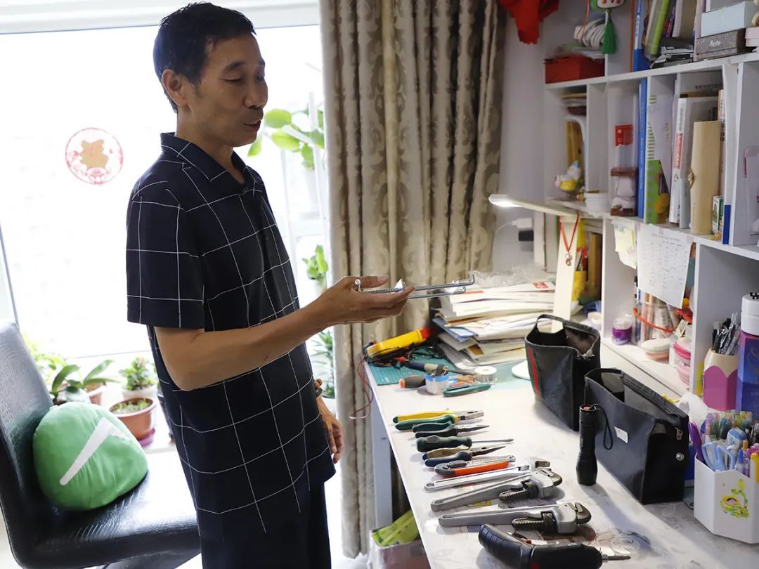 杜文明的工具包里原来装着十余种家伙什儿。给邻居们维修的过程中,遇到需要的工具就随时补充,渐渐他的工具包越来越满、工具越来越齐全。遇到维修的物件需要更换零件,他经常自掏腰包购买。“就几块钱,不是什么事儿。”他说。