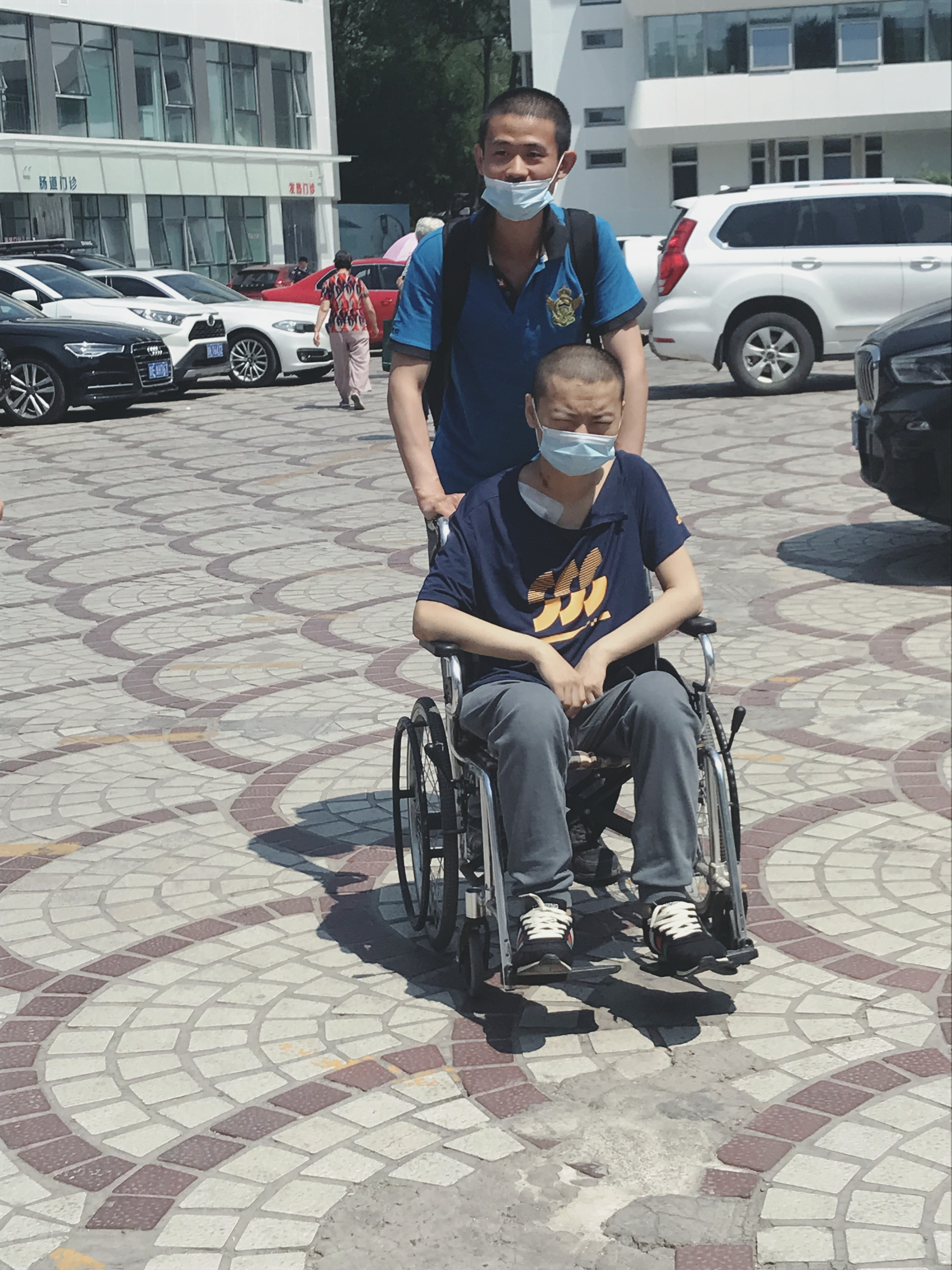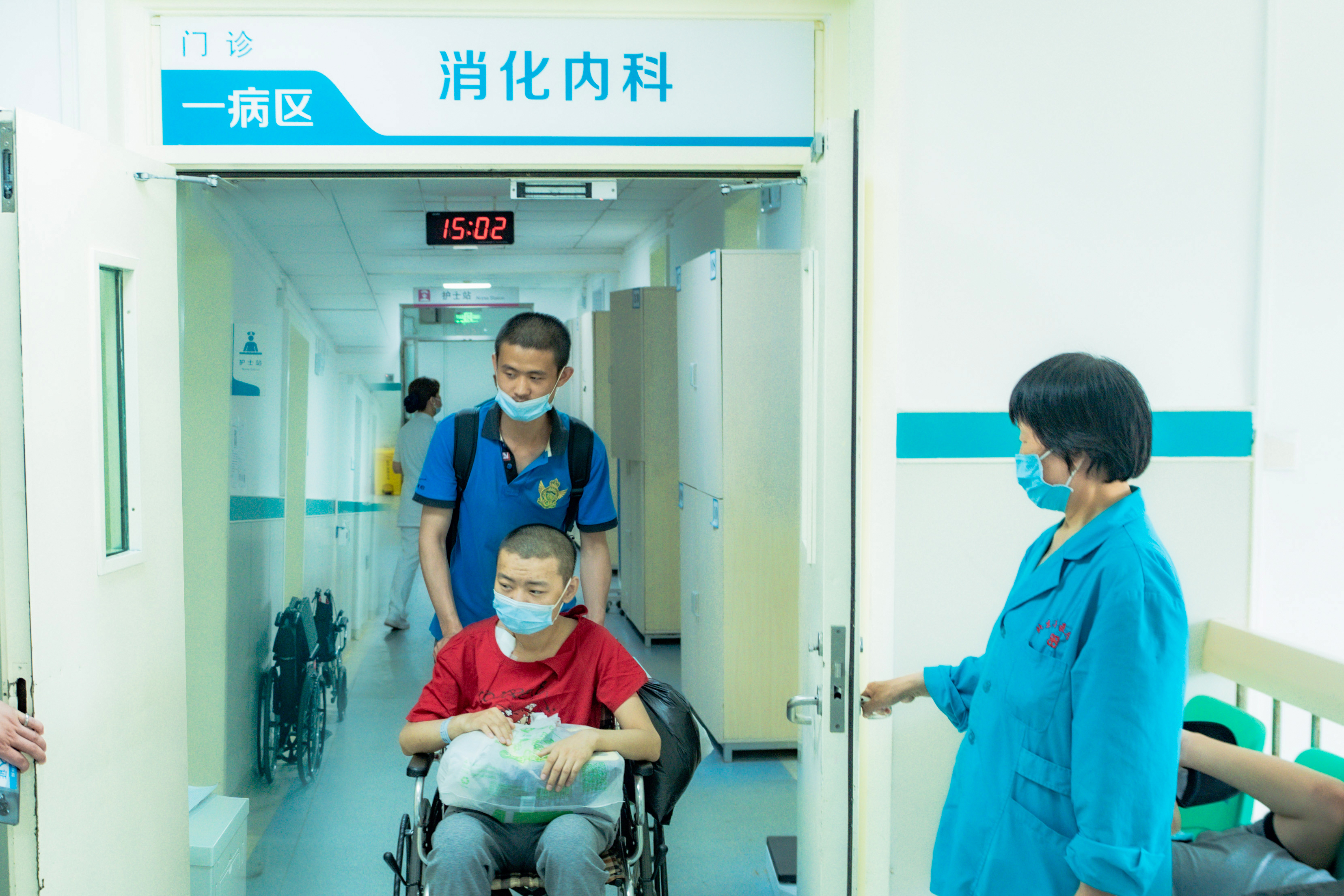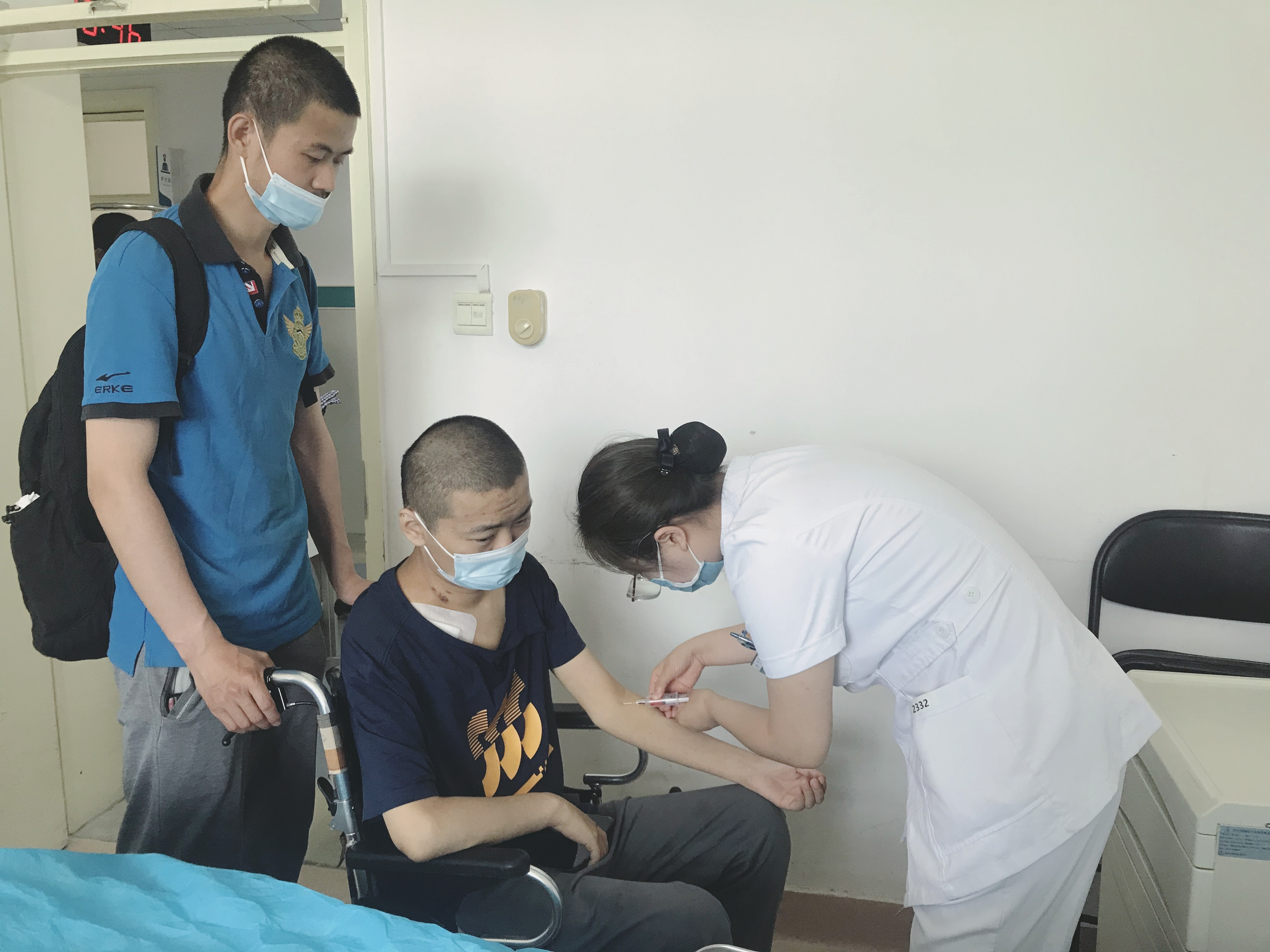 6月14日上午,一个高高瘦瘦的男孩推着坐在轮椅上的哥哥来到位于朝阳区西坝河南里29号的应急总医院住院,兄弟俩一来到门诊四层的消化内科病房,医护人员立即围拢过来嘘寒问暖,安顿下来后,护士为花悦抽血进行相关检查。