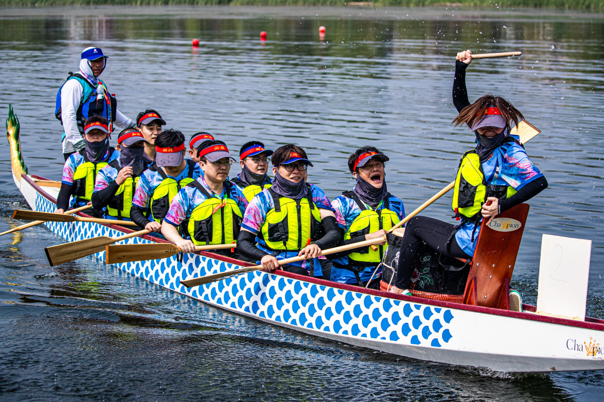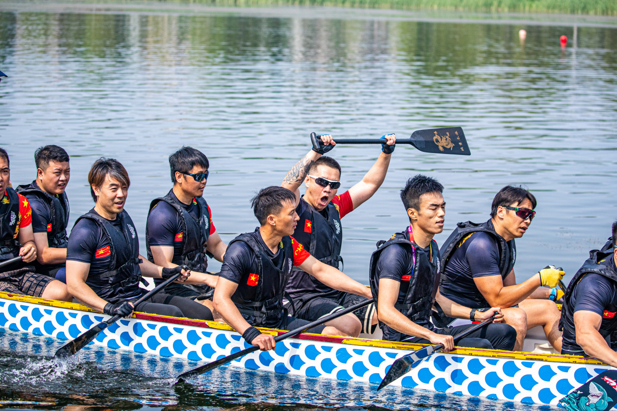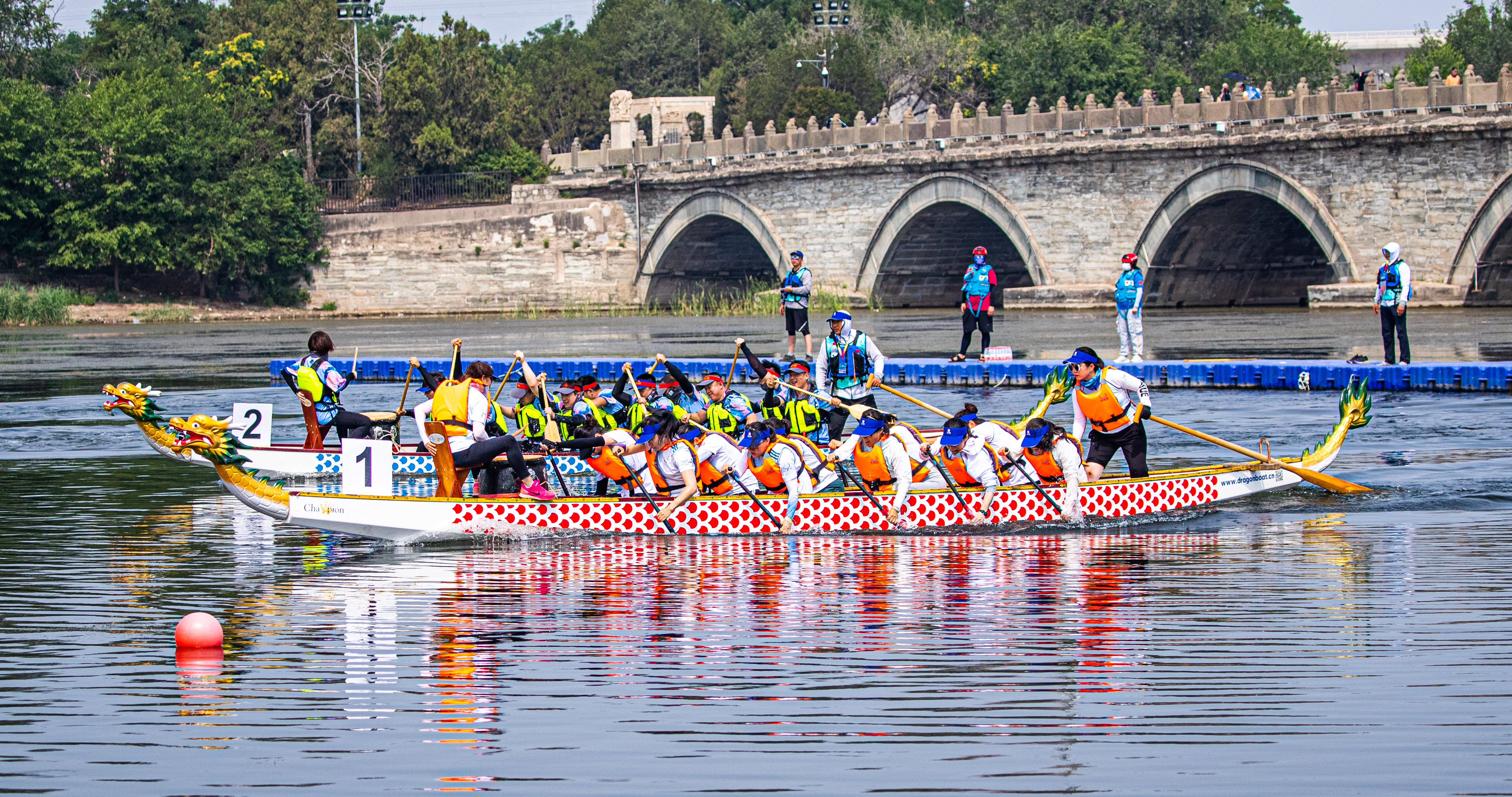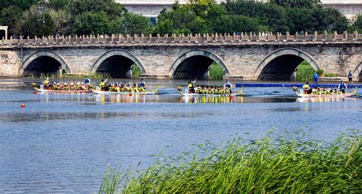 简单而热烈的点睛仪式后,伴随着铿锵有力的锣鼓声,比赛正式拉开帷幕,各支龙舟队如离弦之箭在晓月湖上劈波斩浪。尽管天气炎热,选手们的热情却分毫不减,他们在龙舟上喊着号子,和着鼓点,奋力划桨。“能在卢沟桥下的永定河上比赛太爽了,这里水质很好,所以比我们之前训练成绩还快,可能心情好也是一方面原因,在准备比赛时候还多看了几眼卢沟桥,以前没从这个角度看过。”参加比赛的队员告诉记者。