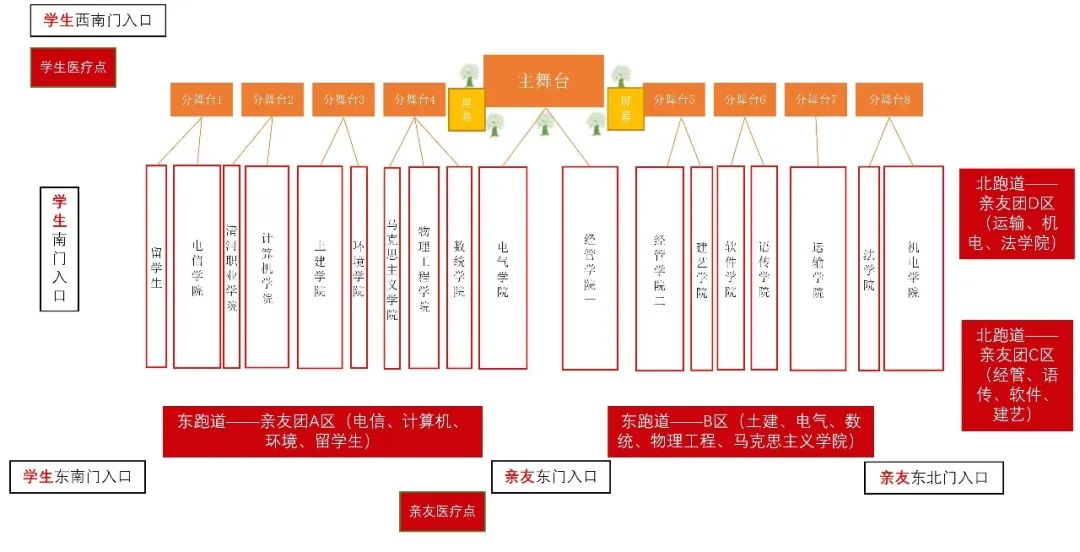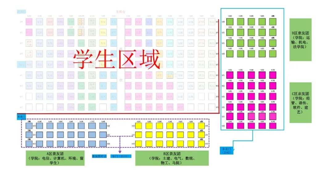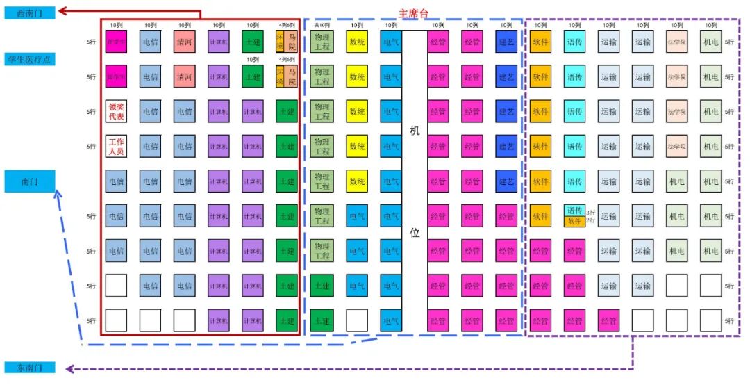 📌 温馨提示:各学院将会统一组织毕业生集中入场,分别从主校区西操场的西南门、南门、东南门进入毕业典礼现场,请学生们按照座位图有序就座。