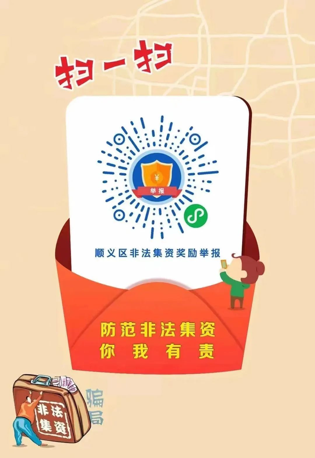 区金融办提示市民朋友,高收益意味着高风险,请大家警惕高利诱惑,主动学习防范非法集资知识,远离非法集资,守住钱袋子、护好幸福家,共同维护顺义区经济金融秩序,努力建设幸福平安的和谐家园。如您发现有非法集资行为的企业,可扫描下方二维码或在微信搜索“顺义非法集资线索”进行举报。举报内容经查证属实的,根据《顺义区非法集资举报奖励办法》,市民将获得相应奖励。