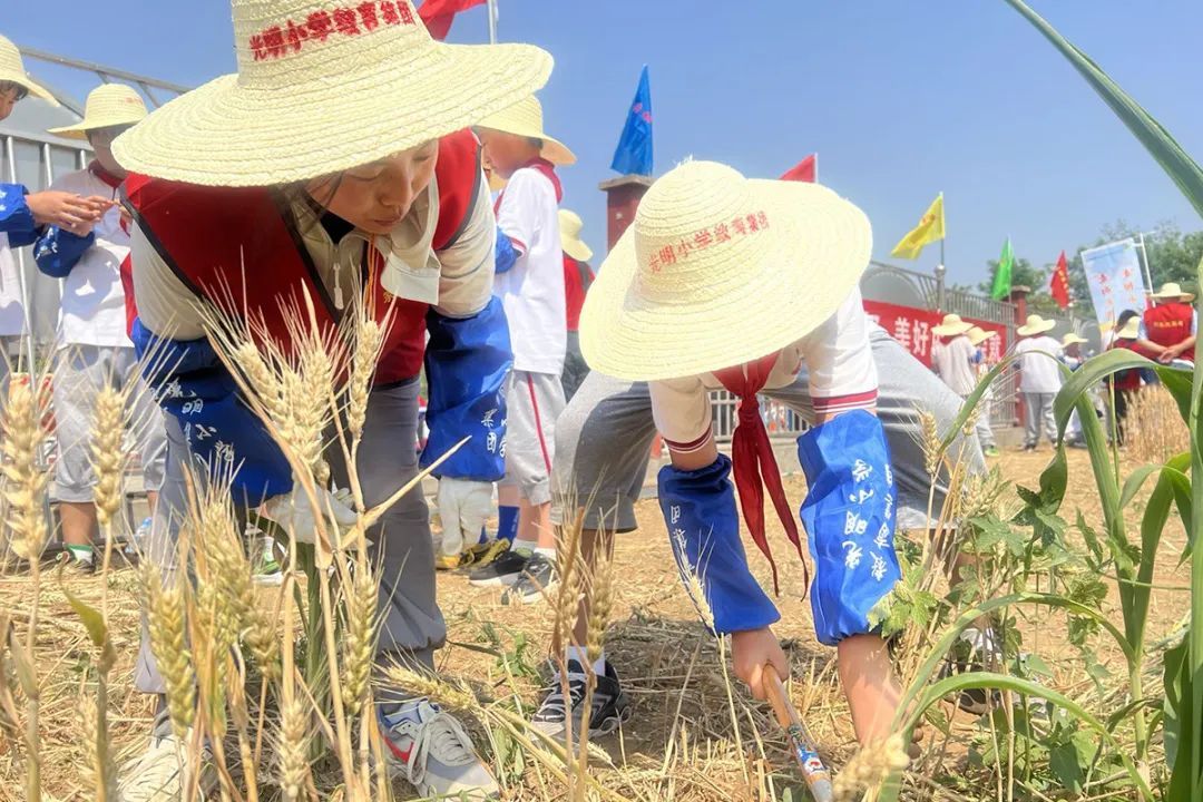 在当天的“麦香廪实 乐享成长”主题体验活动中,学生们变身“小农夫”,手握镰刀,置身8亩农耕田地,在志愿者指导下弯腰割麦,还有的学生品尝麦粒的清香,体验收获的喜悦。