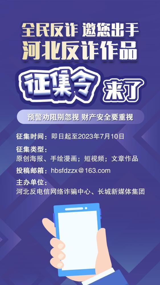 按照全国打击治理电信网络新型违法犯罪工作电视电话会议要求,为切实增强人民群众的防诈意识和识骗能力,广泛动员人民群众和社会各界参与打击治理工作,营造强大舆论氛围,从6月15日起,在全省范围内组织开展为期1个月的打击治理电信网络诈骗犯罪“全民反诈在行动”集中宣传月活动。河北反电信网络诈骗中心联合长城新媒体集团现面向全省征集防范电信网络诈骗作品,全民反诈,邀您出手。