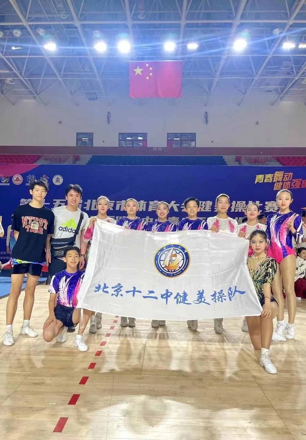 近日,第十五届北京市体育大会健美操比赛在北京市燕山体育馆举行,比赛共有63支代表队、1200余名选手参赛。北京十二中健美操队在冯凯老师、刘华老师以及晋维娜老师的带领下,共派出小学8名队员和中学7名队员参加,其中来自附小预备组的5名小队员也是第一次参加北京市比赛。经过一天的激烈角逐,最终获得5金2银1铜的优异成绩。