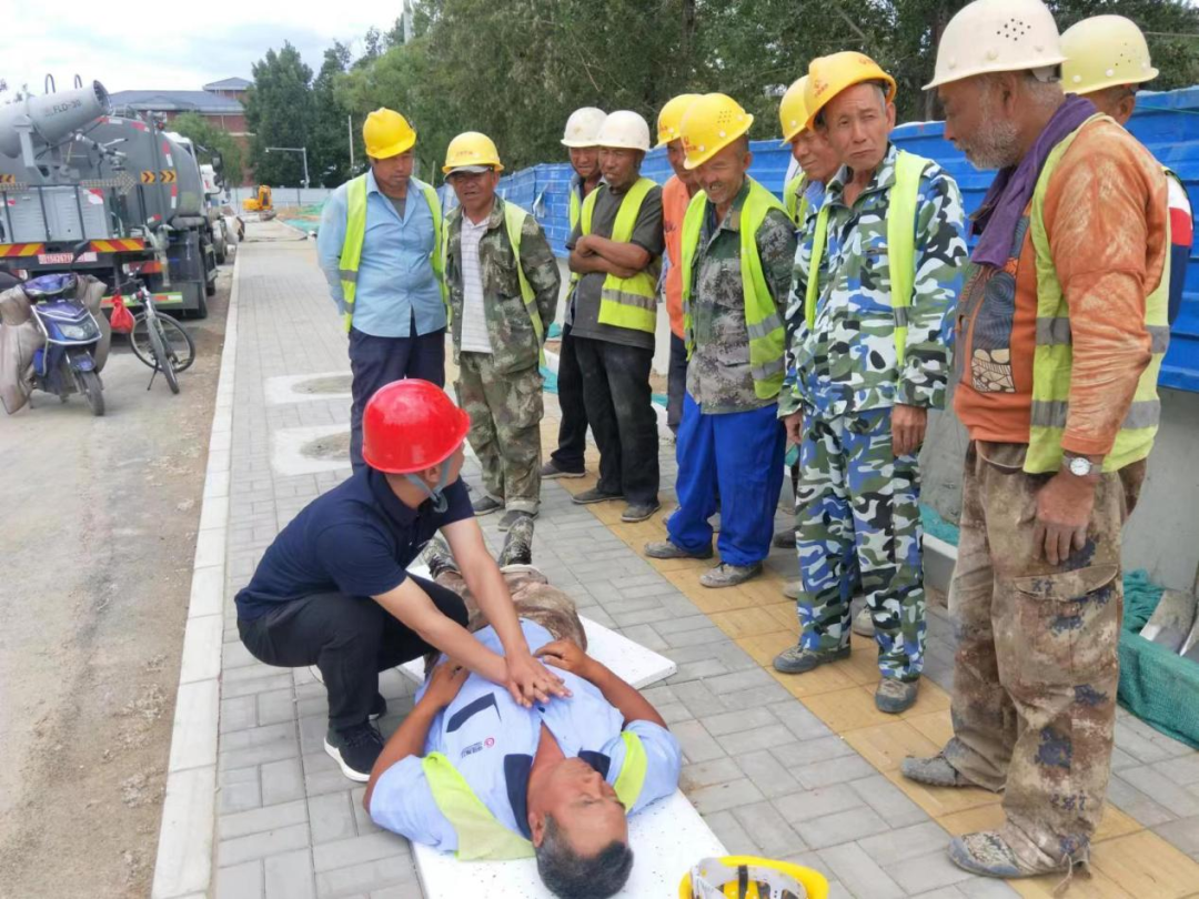 在延庆一职项目工地,施工人员在工作人员的指导下,认真学习心肺复苏应急救护知识,并现场模拟了“人员触电-安全转移-心肺复苏救护”等应急救护过程。