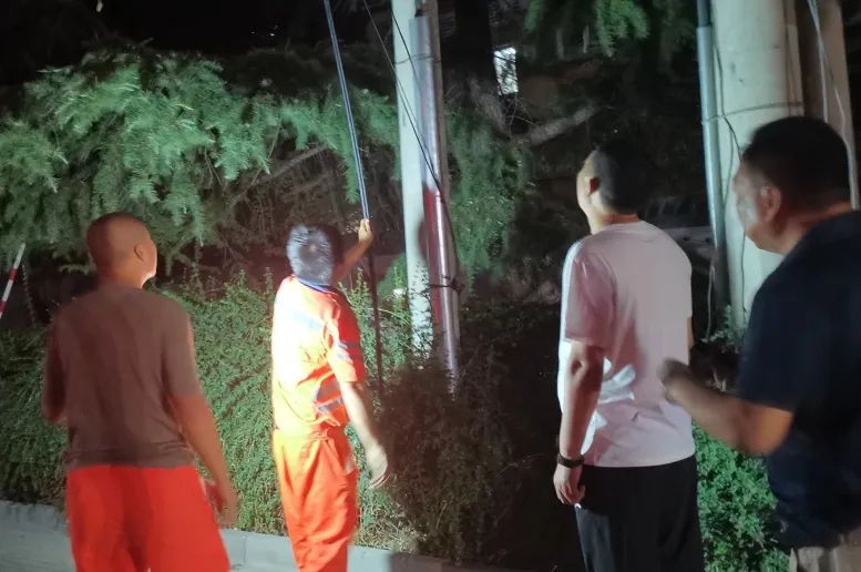 维修人员到达现场后,经过排查断定脱落的为光纤线缆,不影响居民正常用电,从前方路段的高压线上掉落,可能被大风天气刮断。紧张的抢修随即展开,此时天色已黑,抢修工作难度增加,架设高杆、清理周边杂物、梳理电线……工作人员经过2个多小时的抢修,电缆问题终于得到了解决,排除了安全隐患。